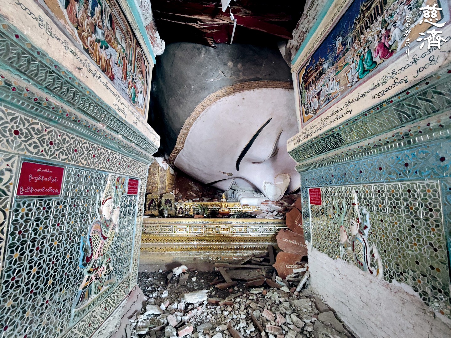 慈済ボランティアは、ミャンマー・マンダレーの地震被災地緊急援助のため、建物の損壊が最も深刻な古都インワを視察した。そのうちの一つ、マハシュエターロン・パゴダでは涅槃仏の頭部が崩れ落ちた。顔面が下に向いて、まぶたが垂れた姿は、あたかも衆生を憐れんでいるかのようである。