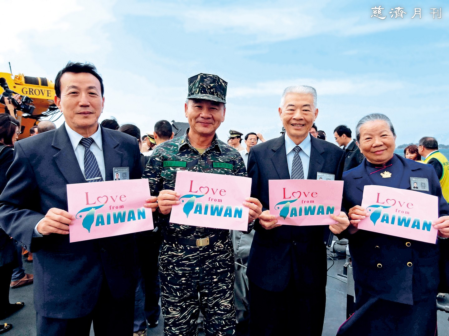 二○一三年菲律賓海燕風災,國防部出動軍艦運送物資前往救災,其中包含慈濟賑災物資,時任海軍陸戰隊指揮官的潘進隆(左二),督導救援物資裝卸與保衛。高雄慈濟人在啟航前特地前來致上祝福,與潘進隆在艦上合影。(攝影/鍾易叡)