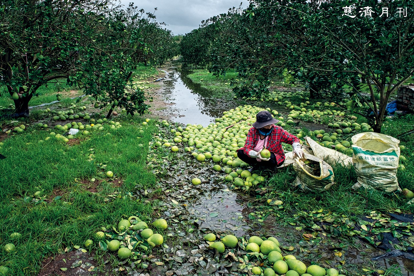丹娜絲狂風暴雨造成農業重鎮嘉南平原重大災損,在臺南麻豆,一位果農將一顆顆跌落的文旦撿入袋中,和樹葉一起丟棄。「會生菌。」她輕輕解釋了為何不等隔日親友來幫忙就先獨自清理,盡快移除落果才能避免滋生病蟲害、保護果樹。雨水在果園形成長長的水道,整年辛勞也付諸流水(圖2)。