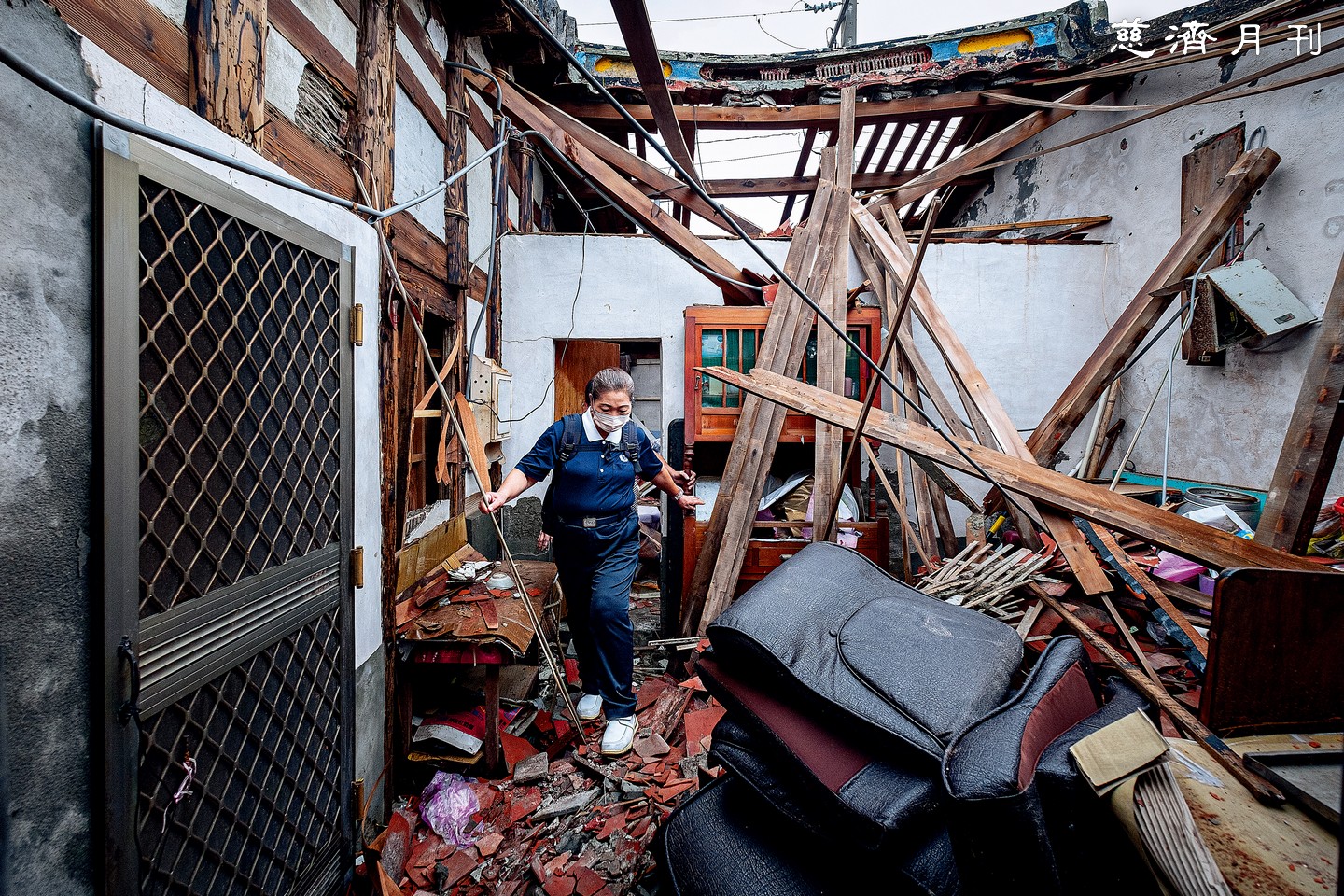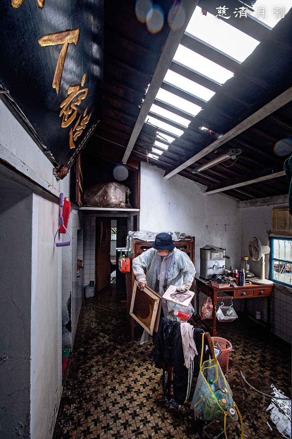 臺南七股區一棟老宅中,民眾正清理著家中老舊、充滿回憶,卻被淋溼毀壞的物件;屋內無電,陽光從被風掀開的屋頂灑落,其實,灑落的還有五分鐘前的豪雨(圖1)。