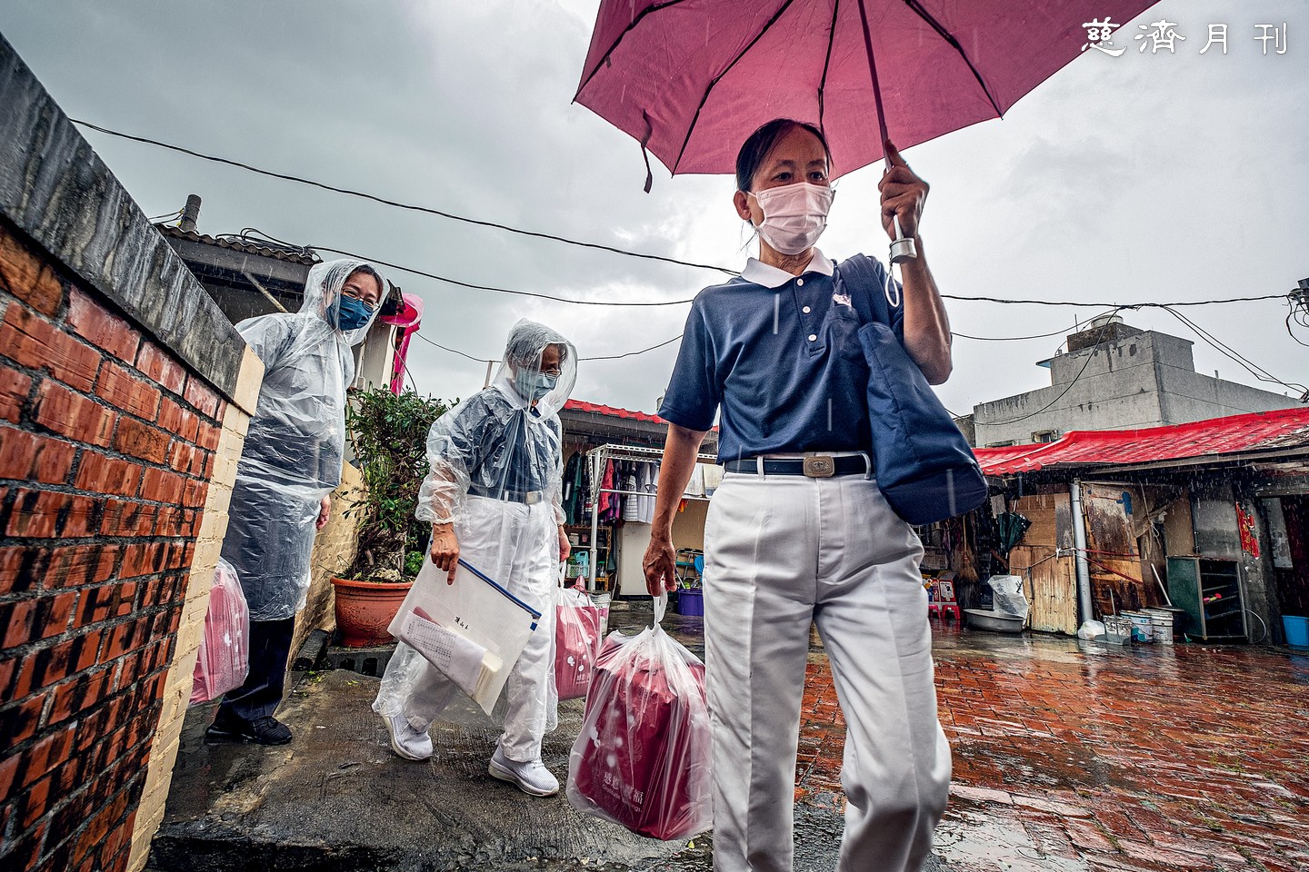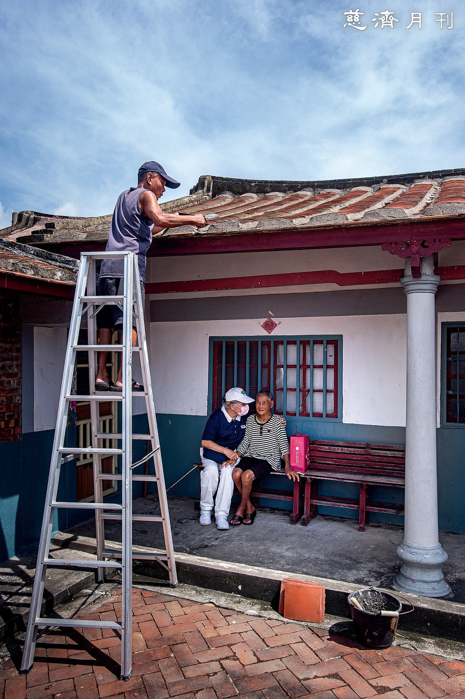 颱風離開後時雨時晴,慈濟志工投入災區復原,展開安心家訪。臺南志工走進七股、北門、將軍、學甲等區,手中提的祝福禮是從花蓮靜思精舍緊急運來的穀粉等乾糧物資(圖1)。在嘉義布袋鎮關懷社區三十多年的志工,與鎮民互動熟稔如家人,傾聽老人家訴說颱風夜驚恐的心情;兒孫們則把握晴天修繕老厝,撿回屋瓦重貼(圖2)。