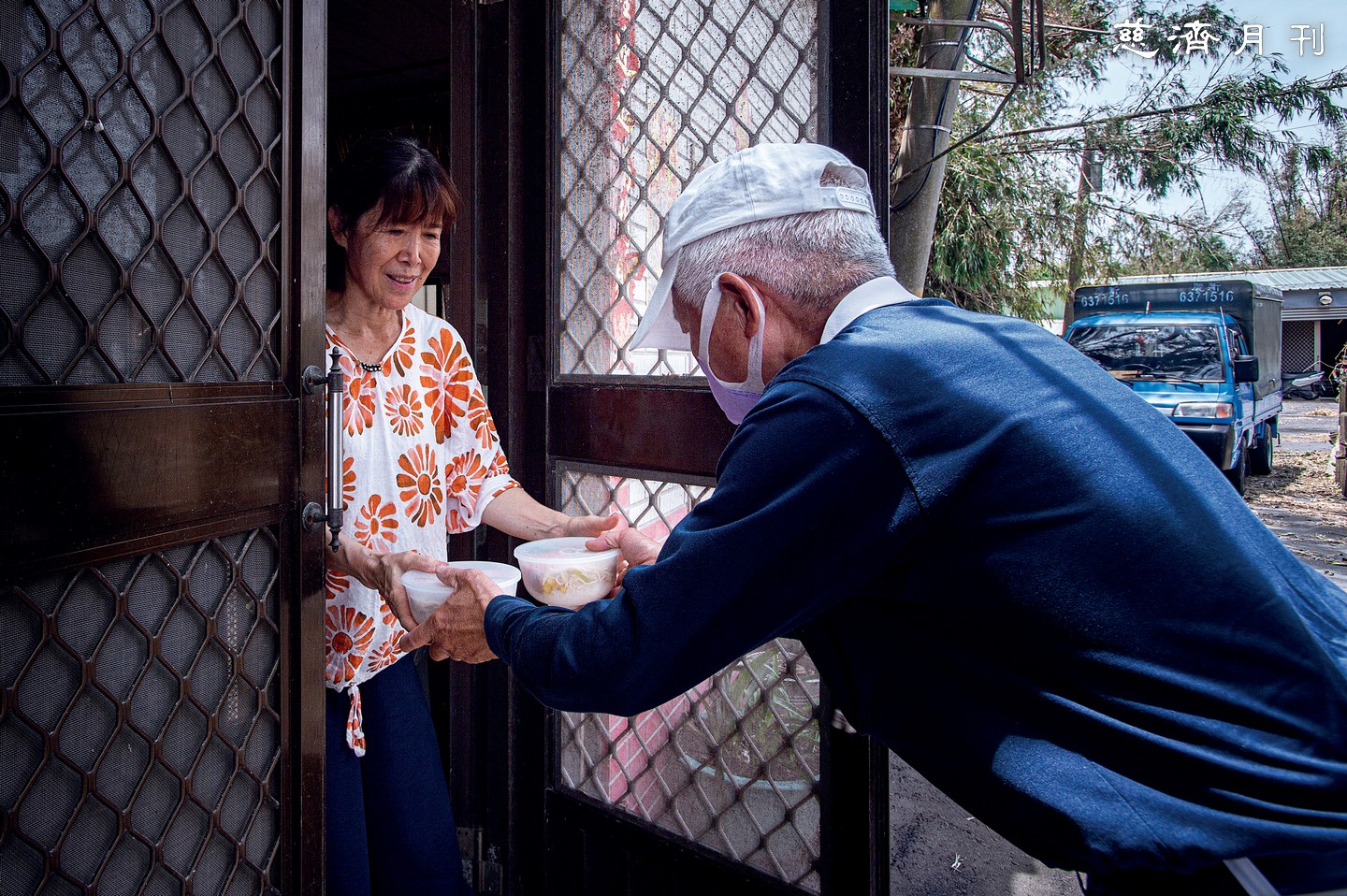 停電停水難以煮食,嘉義、臺南多處慈濟會所持續製作熱食提供給有需求的村里;在嘉義布袋鎮江山里,里長熟悉每一位居民,親自載便當發送。(攝影/黃筱哲)