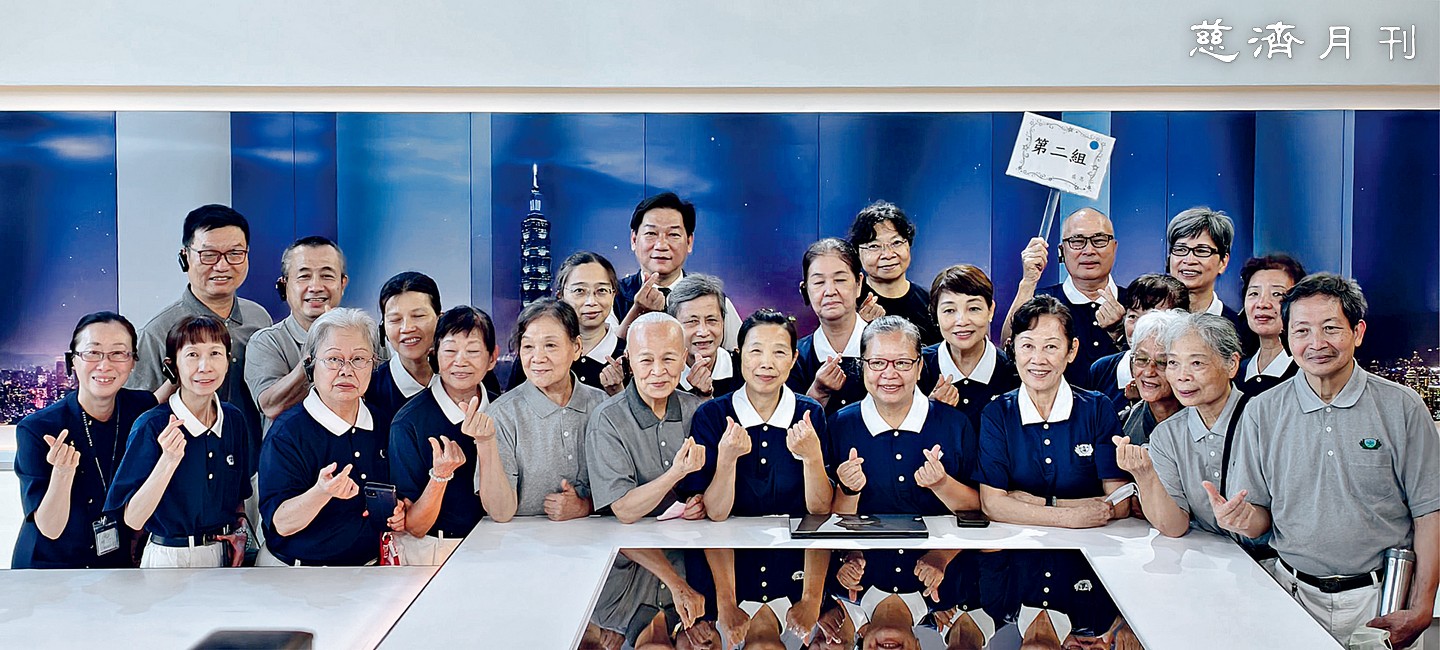 慈濟環保志業屆滿三十五年,各地環保志工參訪大愛電視,臺中環保志工來到攝影棚主播檯,每位都是護持大愛電視的「頭家」。(攝影/游阿賓)