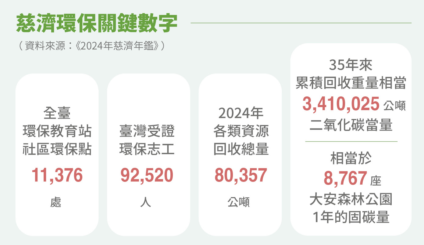 根據慈濟慈善事業基金會的統計,二○二四年一整年,全臺九萬兩千多名慈濟環保志工,總計回收了八萬多公噸各式物資,包含三千五百八十一公噸塑膠袋、六千五百三十三公噸玻璃瓶等品項,三十多年的努力,相當於減少了三百四十一萬公噸二氧化碳排放量。儘管這些數字和同時期地球所承受的環境破壞相比,是九牛一毛,但全臺乃至全球慈濟環保志工不以善小而不為,持續為地球、為人類永續而努力。