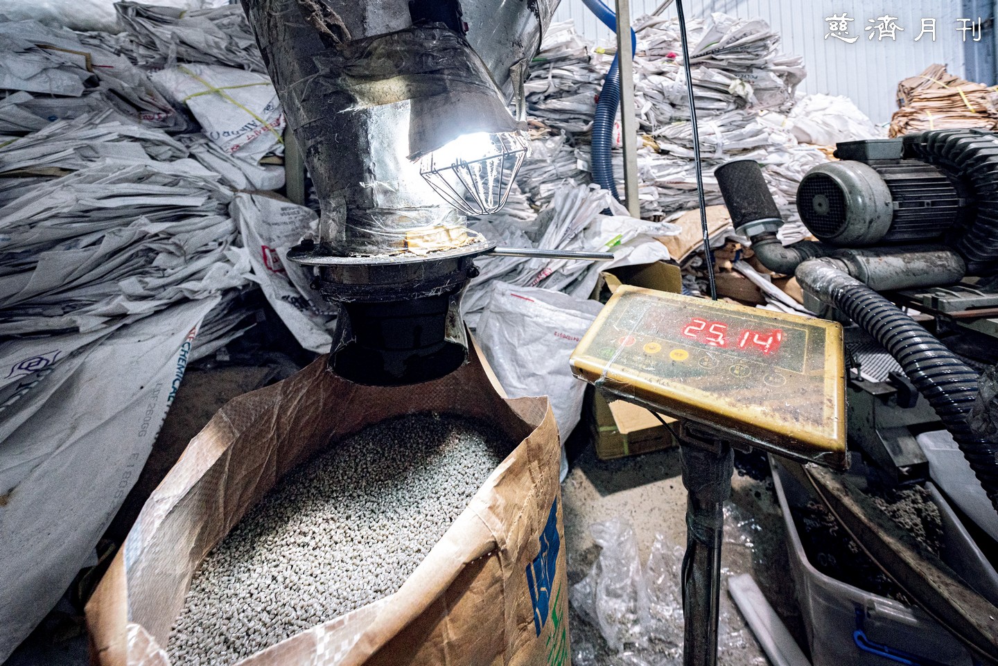 塑膠袋材質輕薄,拾荒者多不回收,慈濟環保志工用心整理、打包(圖1),尋找廠商再製成塑膠粒原料(圖2),不計獲利多少,只為減少大地污染。(攝影/蕭耀華)