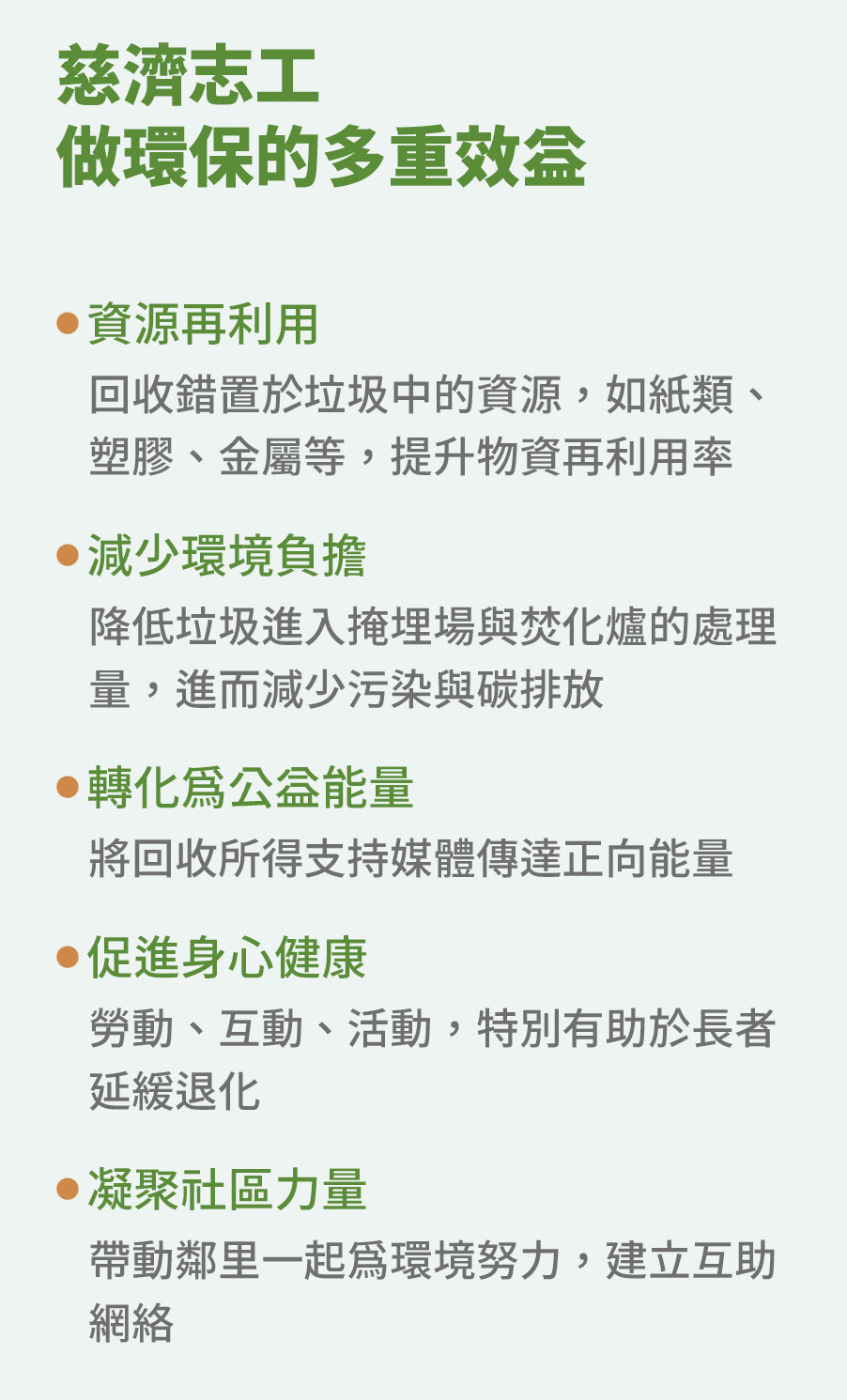從自家門口、街坊鄰里做回收開始,目前全臺有超過九萬位環保志工,各縣市鄉鎮有慈濟環保站、點,「手」護大地的行動如微血管般深入鄰里,默默發揮了降低環境負擔、增加資源回收再利用率的正效益。