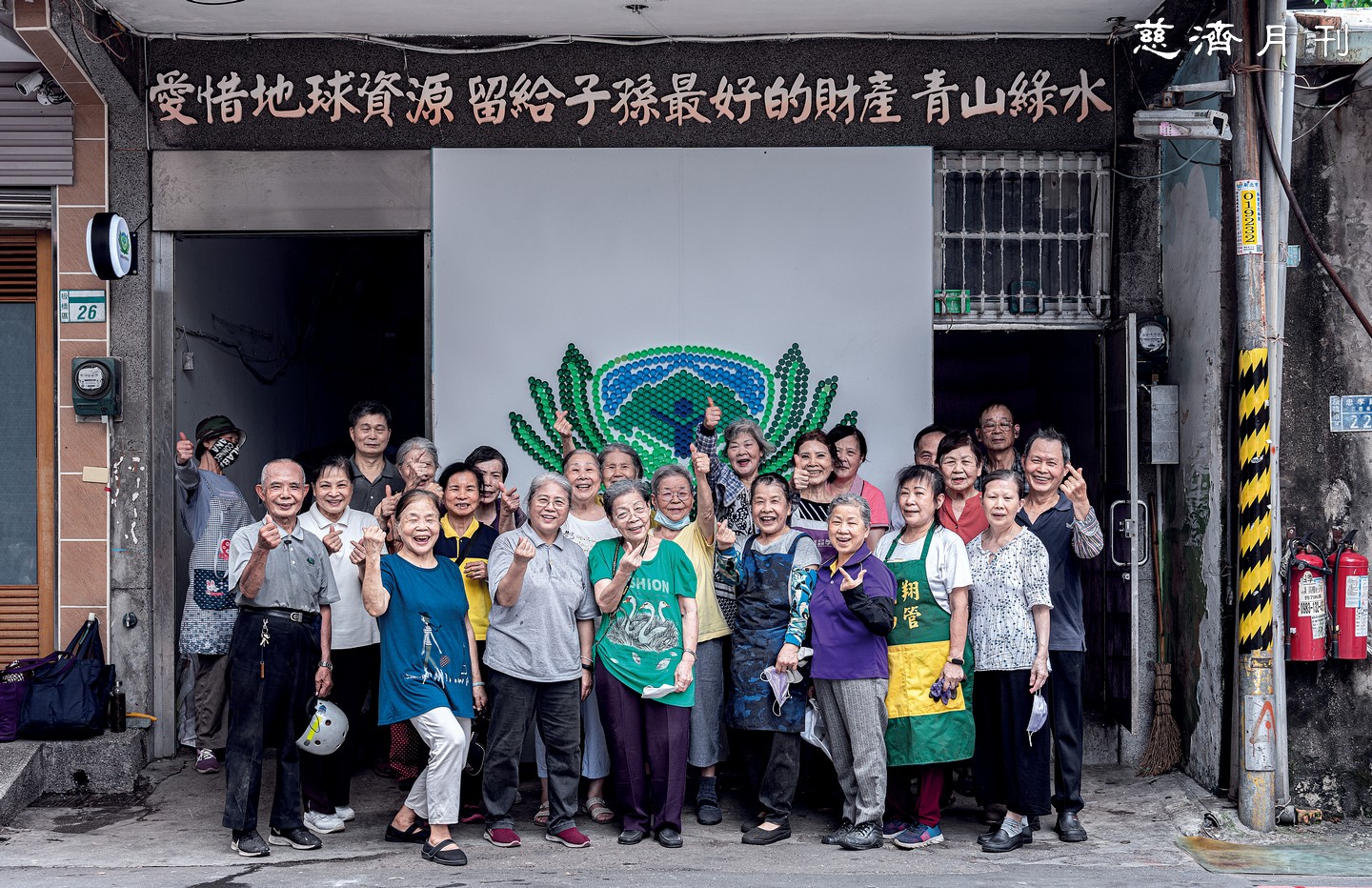 回收寶特瓶蓋拼出慈濟環保志業標誌,志工草根的笑容中,有著共同心願—愛惜地球資源、將青山綠水留給子孫。(攝影/蕭耀華)