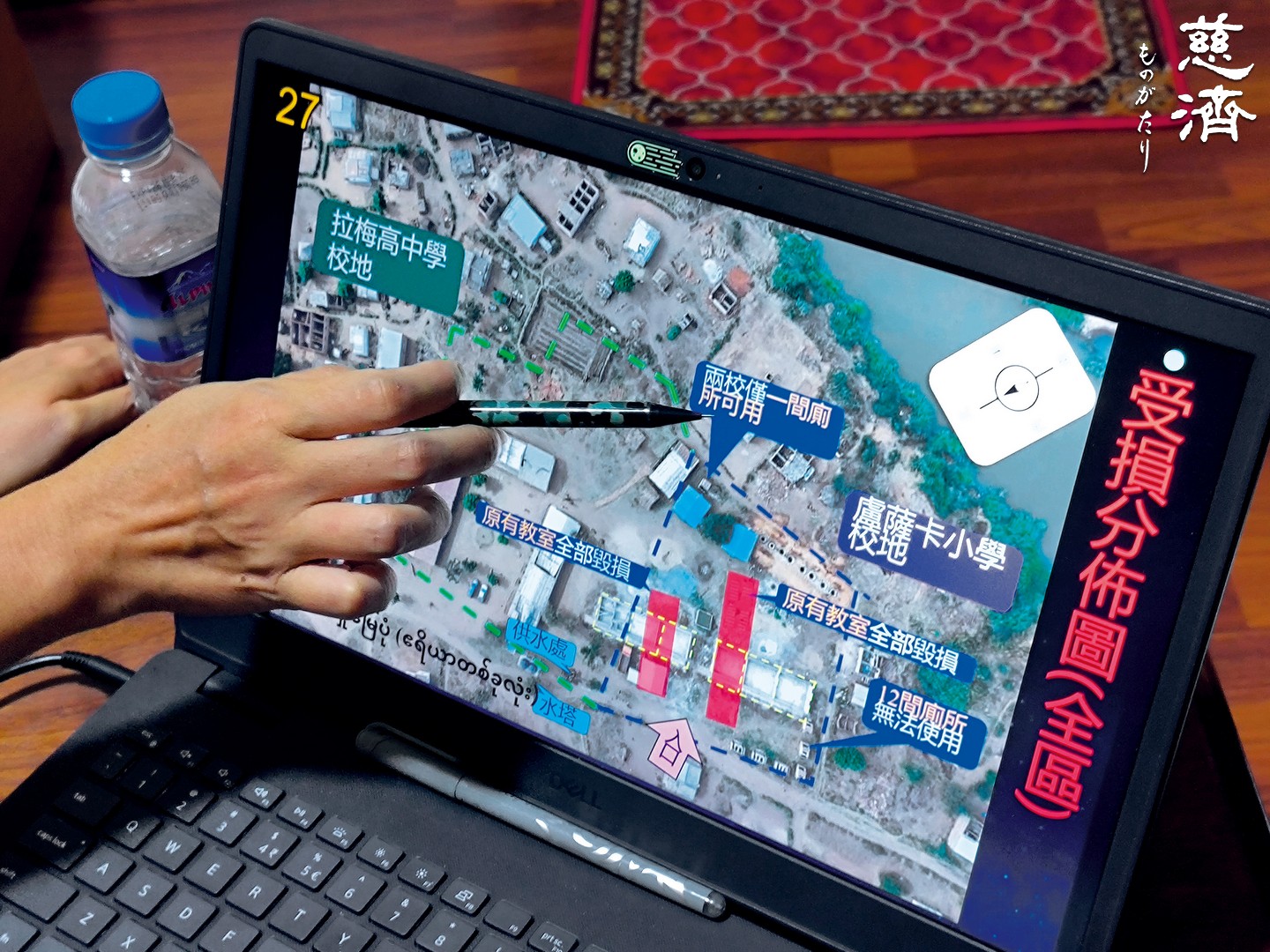 現地調査チームはミャンマーとマレーシアのボランティアで構成され、第一段階の緊急援助を終えると四月二十三日に花蓮の静思精舎に戻り、現地の様子や住民と僧侶の生活状況、建物の被害状況を報告した。これらの報告は今後の支援方針を定めるうえで重要な参考情報である。