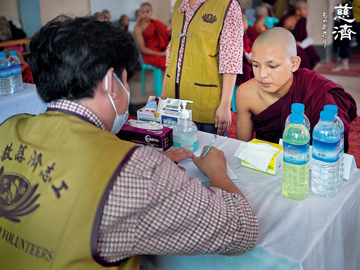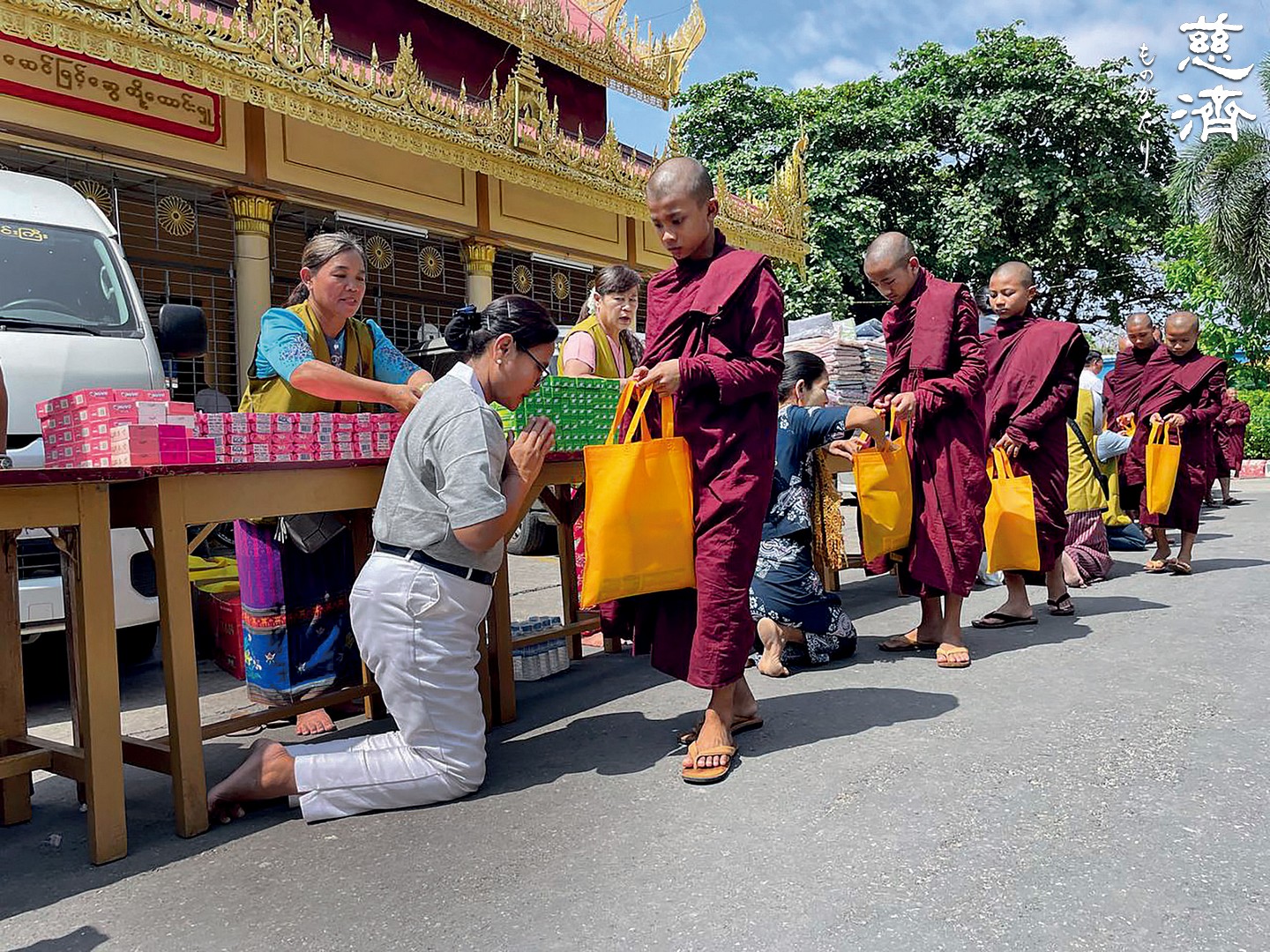 五月一日から六日にかけて、ボランティアは六十六回にわたる物資の配付活動を終え、寺院や孤児院、老人ホームに食料、福慧ベッドなどを贈呈した。五月六日には、慈済はネイ・ミン僧院とバゥドゥウィンジ町のレイ・キュン・マン・アウン仏教教学僧院で施療を行った。ネイ・ミン僧院には三百人の寄宿生がおり、多くが北部の内戦地域から来ている。被災後は皆一階の狭い空間に身を寄せ合っていたが、混雑と蒸し暑さが続いたため、沙弥(しゃみ)たちは皮膚病にかかり、掻きむしってできた小さな傷がなかなか治らなかった。ボランティアは医療スタッフを招いて、診察してもらった。