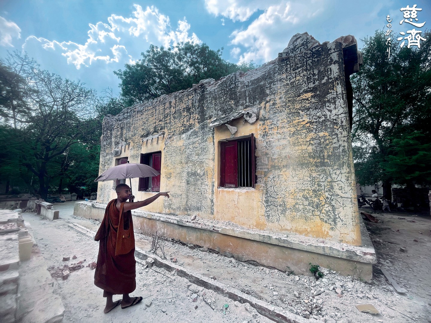 マンダレー地方では、およそ700の仏塔や寺院が地震で被害を受けた。バガン王朝時代に建立されたタダーウー郡のイェー・ター・ファン僧院で、僧侶がボランティアに被災状況を説明していた。(撮影・陳勇珽)