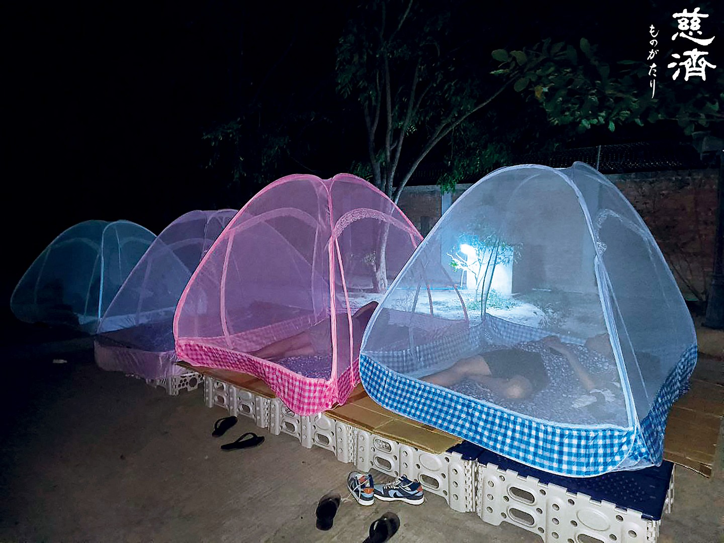 4月下旬、ボランティアがマンダレーに到着した初日の未明、再び地震が発生し、多くの住民が慌てて外に飛び出した。ボランティアチームは工場の建物へ避難し、福慧ベッドの上に段ボールを敷き、蚊帳を張って一夜を過ごした。(撮影・陳勇勝)
