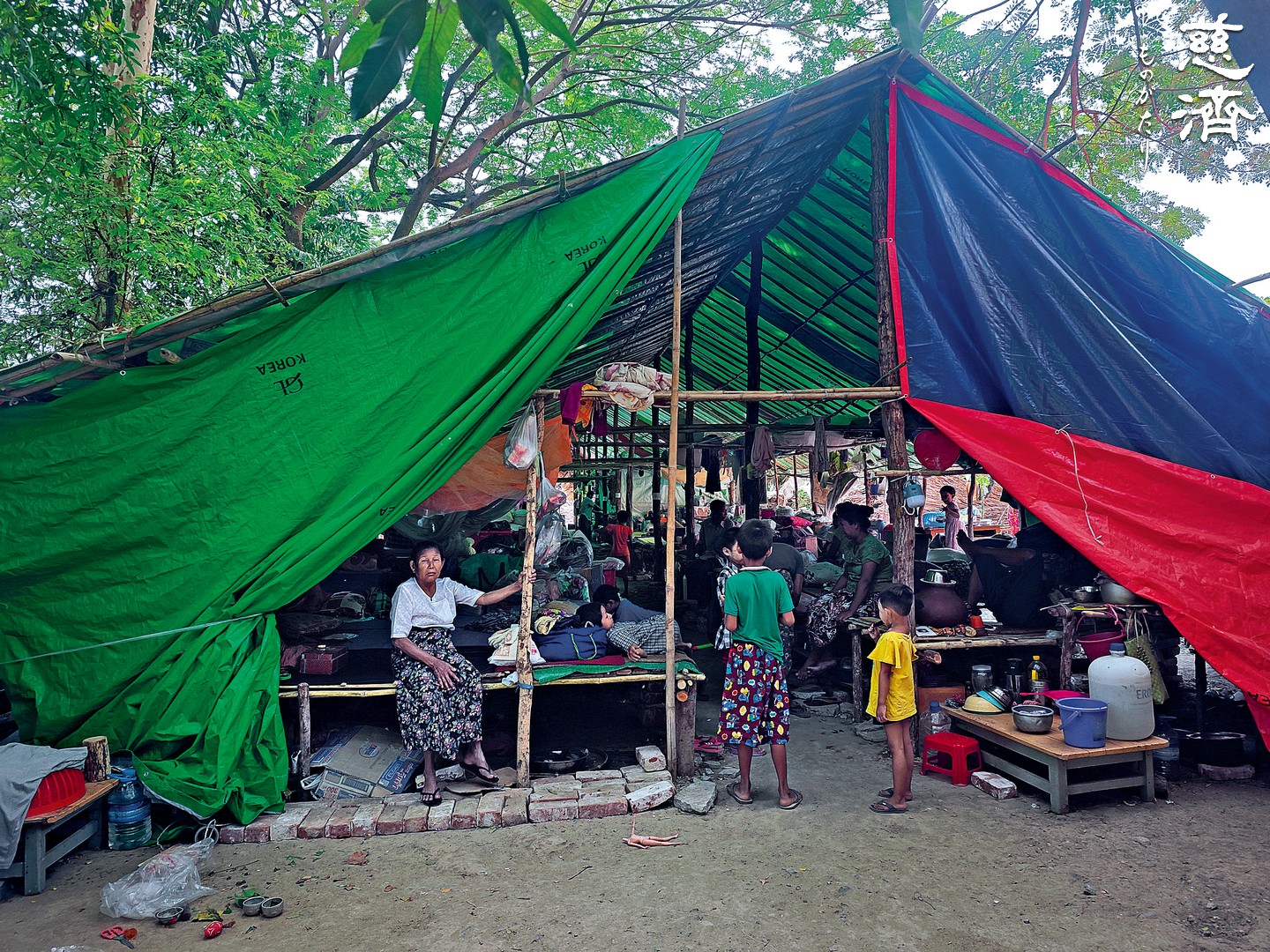 ボランティアはブルーシートを購入し、「仕事を与えて支援に代える」活動に村民を招いて、マハー・ガンダー・ヨン僧院に雨よけのテントを建て、被災世帯を受け入れた。(撮影・郭威陽)