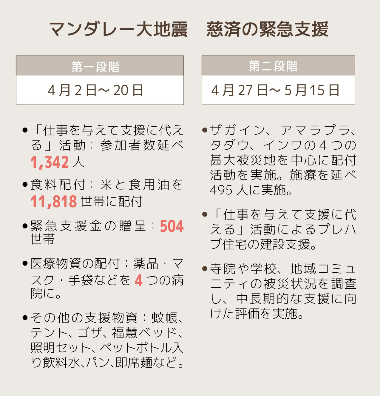 三月二十八日、ミャンマー第二の都市マンダレーで大地震が発生した。ボランティアは四月二日に被災地に入り、緊急支援物資を配付した。また「仕事を与えて支援に代える」活動で被災した住民を雇って雨よけの簡易テントを建て、一時的だが住めるようにした。この作業は、四月二十日に被災地を離れるまで続いた。疲れを癒す暇もなく、四月二十七日から再び複数のチームに分かれてマンダレーへ向かった。今回の任務はさらに明確で、物資の配付だけでなく、寺院や学校、地域の状況を記録し、中長期支援に向けた情報収集を行った。