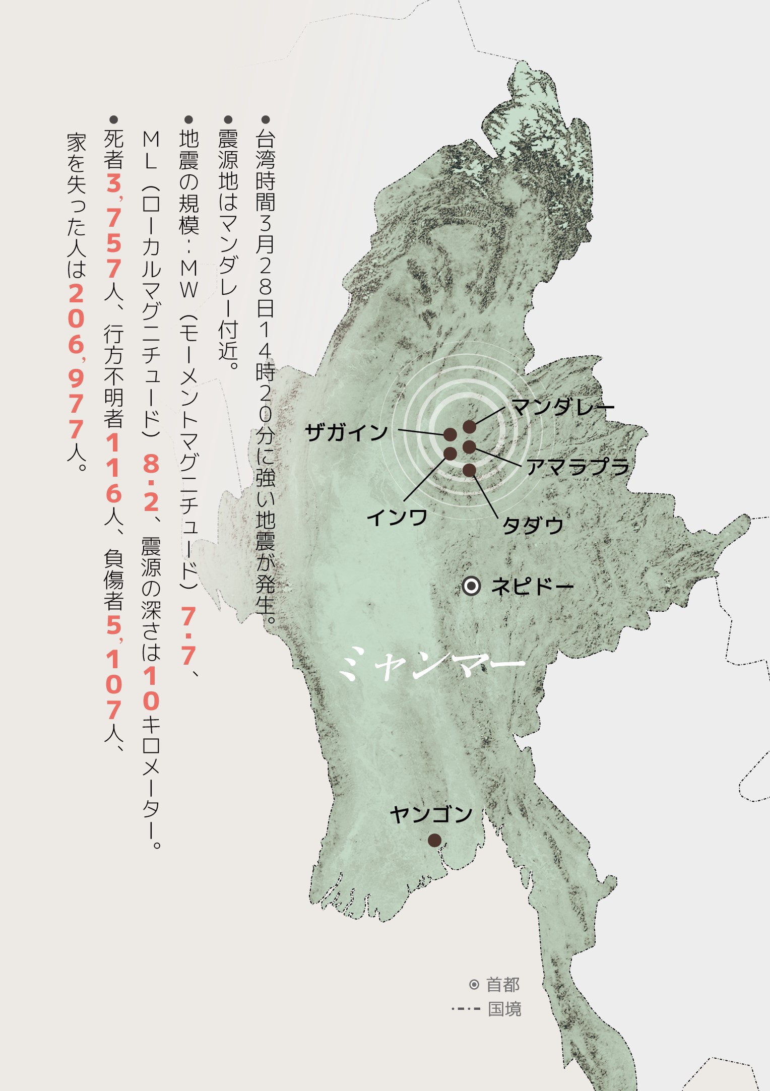 三月二十八日、マンダレーで大地震が発生した。慈済ボランティアは被災地への緊急支援に駆けつけ、十八日間支援し、ヤンゴンに戻ってわずか一週間後、再び被災地へと向かった。酷く損壊した寺院や孤児院の有り様と、永遠に引き裂かれた人々の悲痛な叫びが、今も彼らの心に重くのしかかっている……。