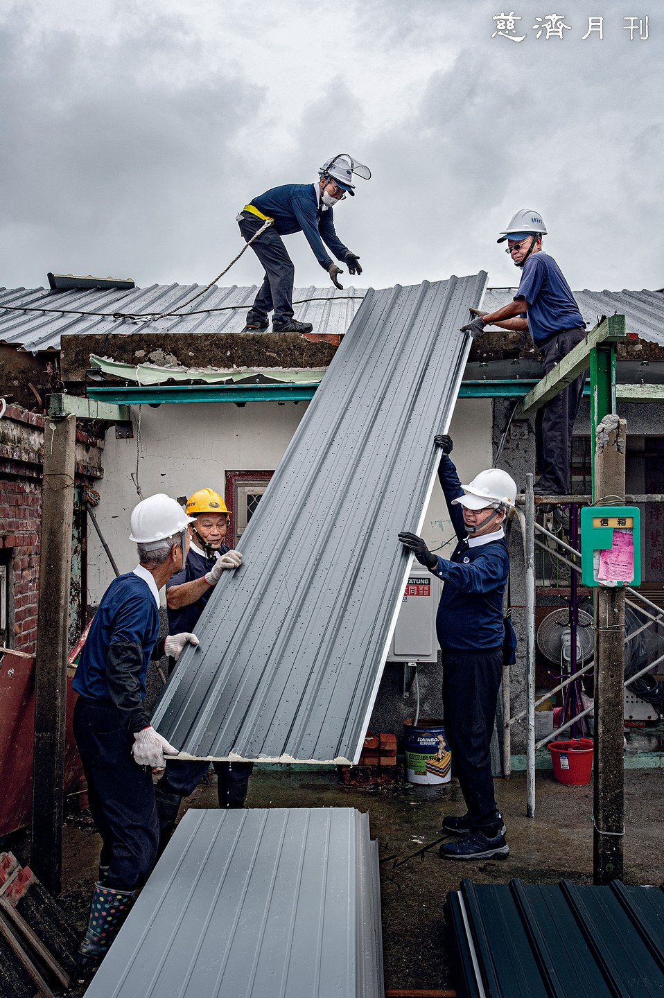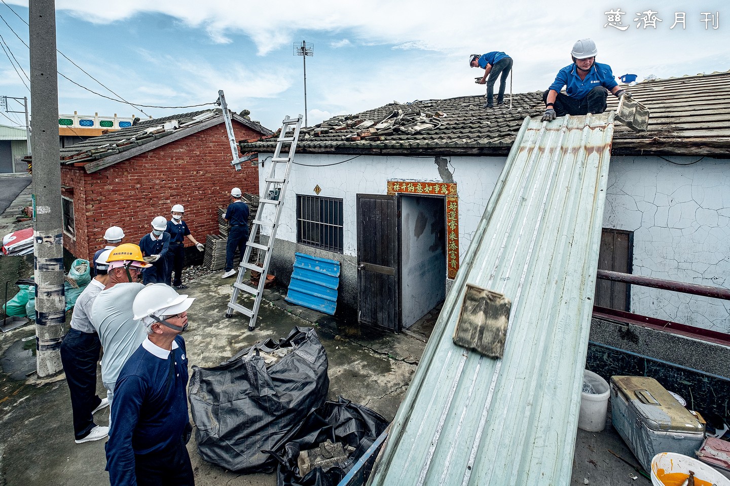 臺南北門區錦湖里渡子頭的這位獨居長輩是聾啞人士,也不懂手語;臺南在地的工程廠商龍宗清在八月五日派了三名師傅到場作業—拆除屋瓦、覆上新屋頂。工頭以一片舊鐵皮當作滑梯,將屋瓦滑下,志工再接力搬運和堆疊整齊。齊聚多人一起為他付出的景象,無需語言,一定能傳到老先生心中。