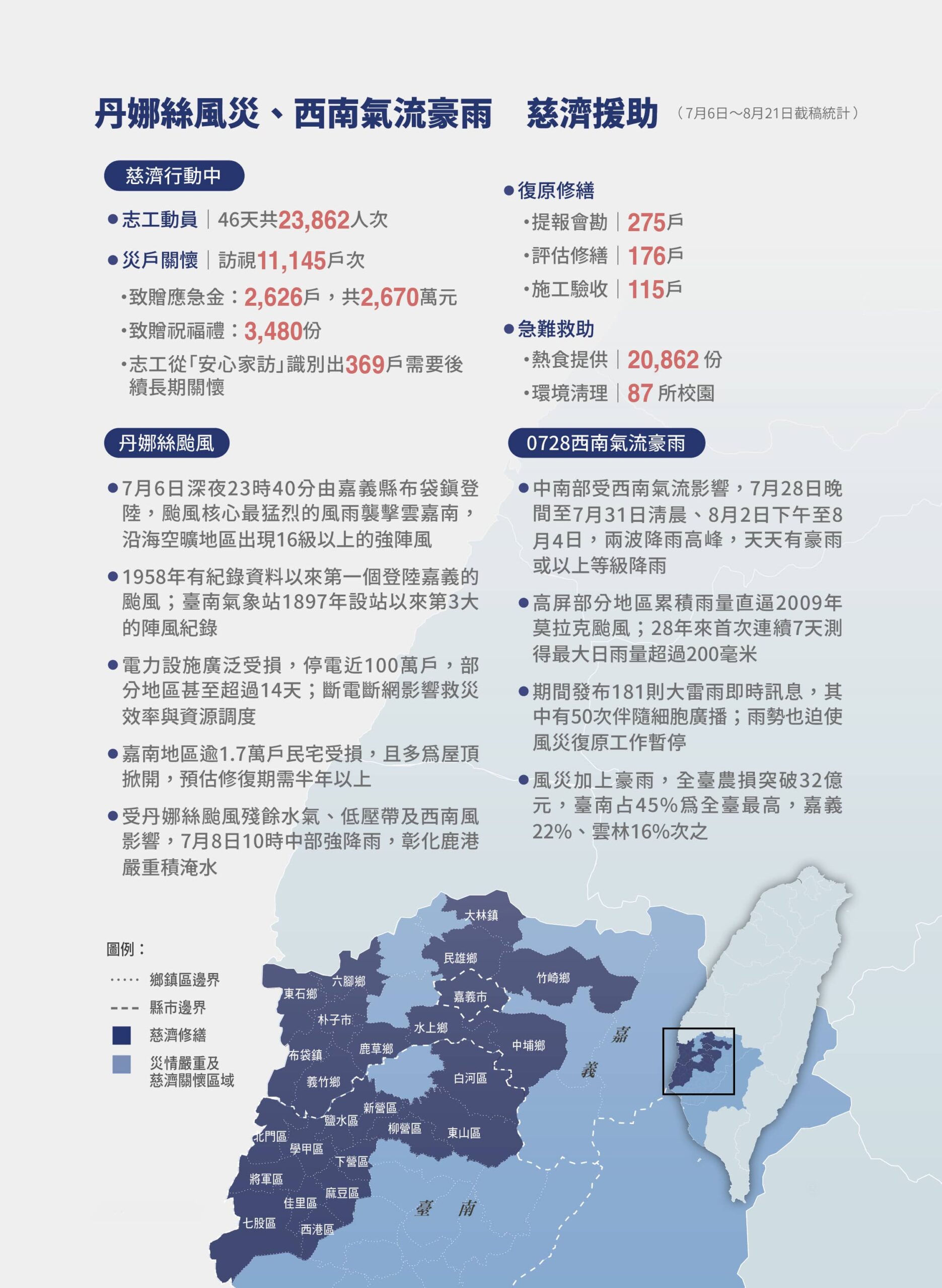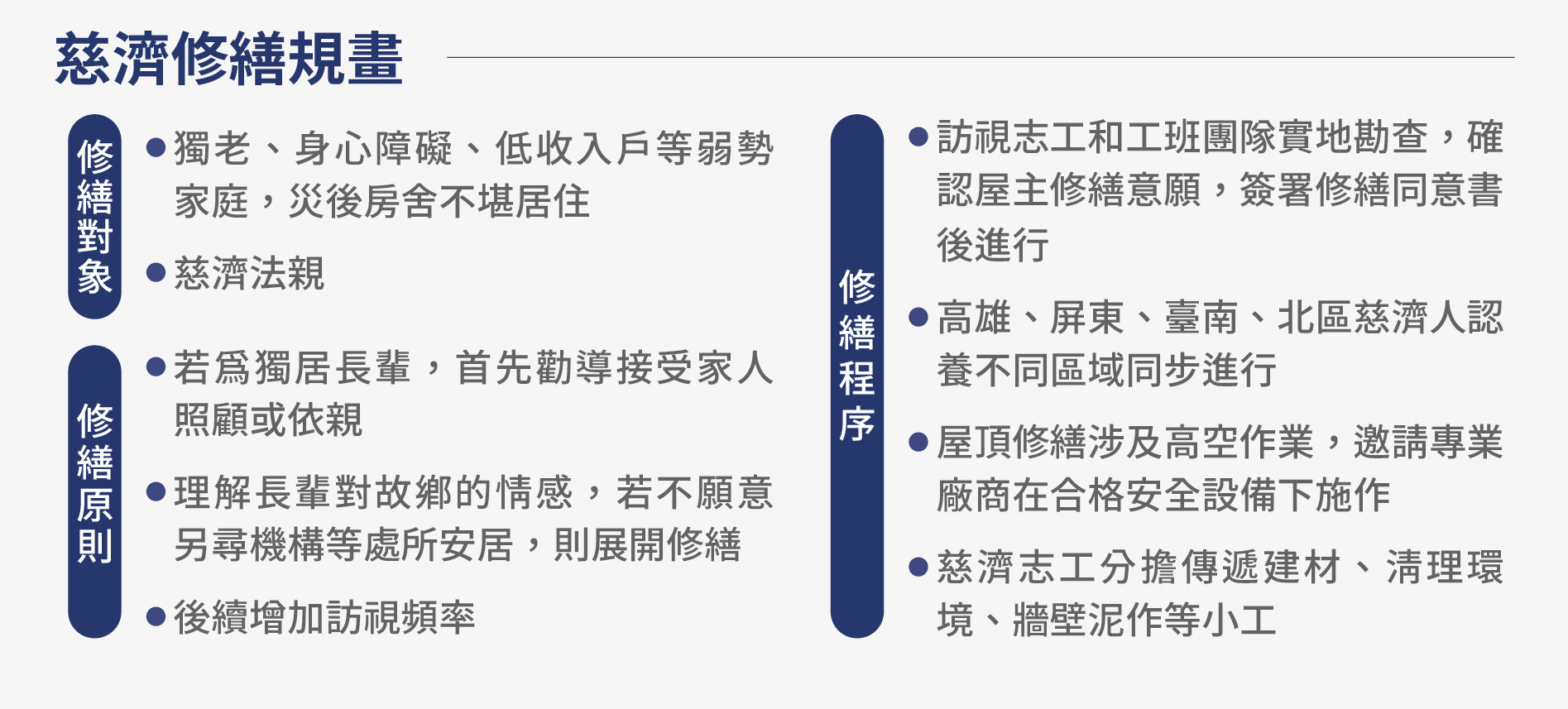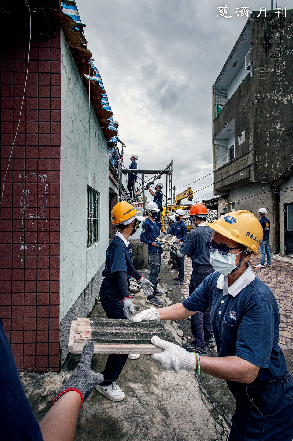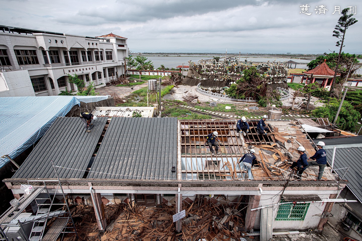 災後修繕,慈濟基金會與臺南市政府合作,在五個災害脆弱區協助弱勢受災戶修繕屋頂,在嘉義同樣與公部門合作進行;由基金會營建處負責媒合志工與專業廠商投入,選用合宜耐候材料、協助規畫施工方式,期盼讓受災鄉親早日安心回家。廠商們為了幫助受災戶,很多都將原本手上的工作暫緩,不計人力和物料成本,在南部目前極度缺工缺料狀態下,他們挺身一起幫助許多家庭復原。