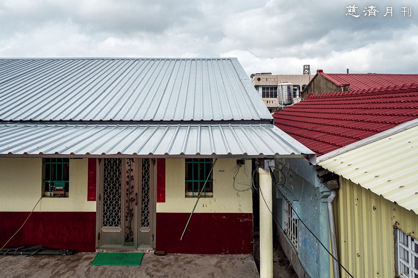 七月下旬天氣不穩,工班在西寮里採取邊拆邊蓋的方式,左側已完成,右側屋瓦卸下後,師傅在完好的主梁鋪上從高雄運來的屋頂鋼板。
