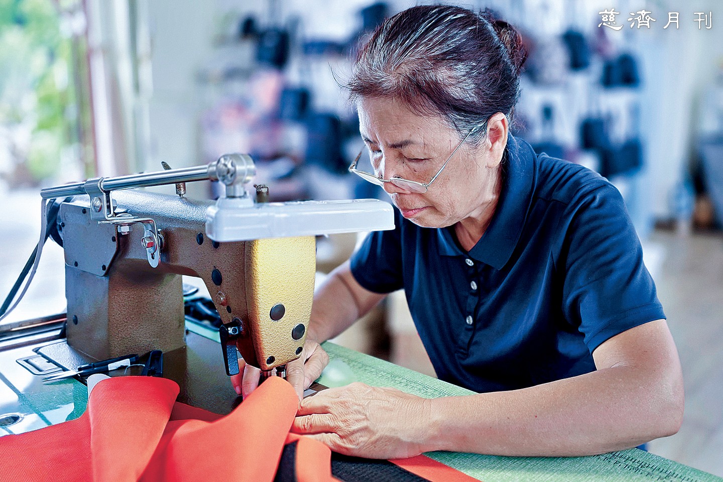 人家有需求,我們就要供應!」東大靜思堂巧藝坊窗口林鳳守,將一塊長條紙板壓在防水布料上,縫紉機咻咻地快速車出直線,「有了這張紙板,防水布就不會滑掉,車出來的縫份又直又美。」