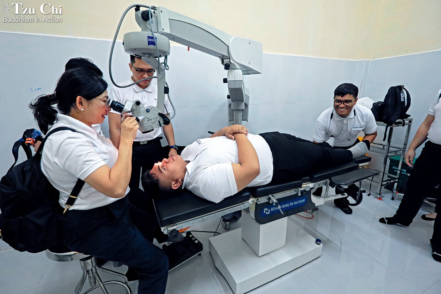 A month before the event, Tzu Chi’s Cambodian volunteers and doctors from TYDA began conducting preoperative eye screenings to prepare for cataract and other surgeries that would be performed by physicians from the Tzu Chi Eye Center in the Philippines. The ophthalmology team from the Philippines brought 22 boxes of instruments, medications, and medical supplies (photo 1) and conducted multiple equipment tests and trial runs (photo 2).