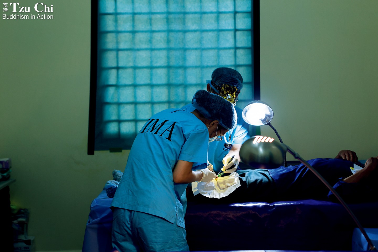 A surgeon taking part in a Tzu Chi free clinic held in Cambodia this past May operates on a patient to remove a tumor. Instead of a disposable surgical drape, white sterile wrapping paper from a surgical glove box was used—an environmentally conscious choice that reflects Tzu Chi’s values.