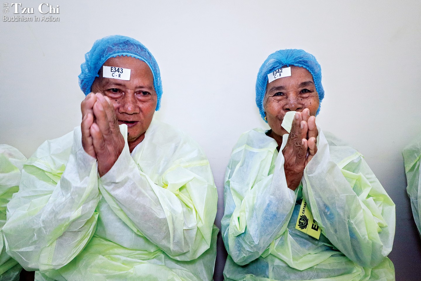 Patients in surgical gowns and caps (photo 1), with labels affixed to their foreheads, wait for cataract surgery. A volunteer applies dilating eye drops to a patient before the procedure (photo 2). Dr. Antonio Say (second from right in photo 3) from the Philippines examines a patient’s recovery the day after her surgery. Photos 1 and 3 by Jamaica Mae Digo; photo 2 by Chai Mong Ping