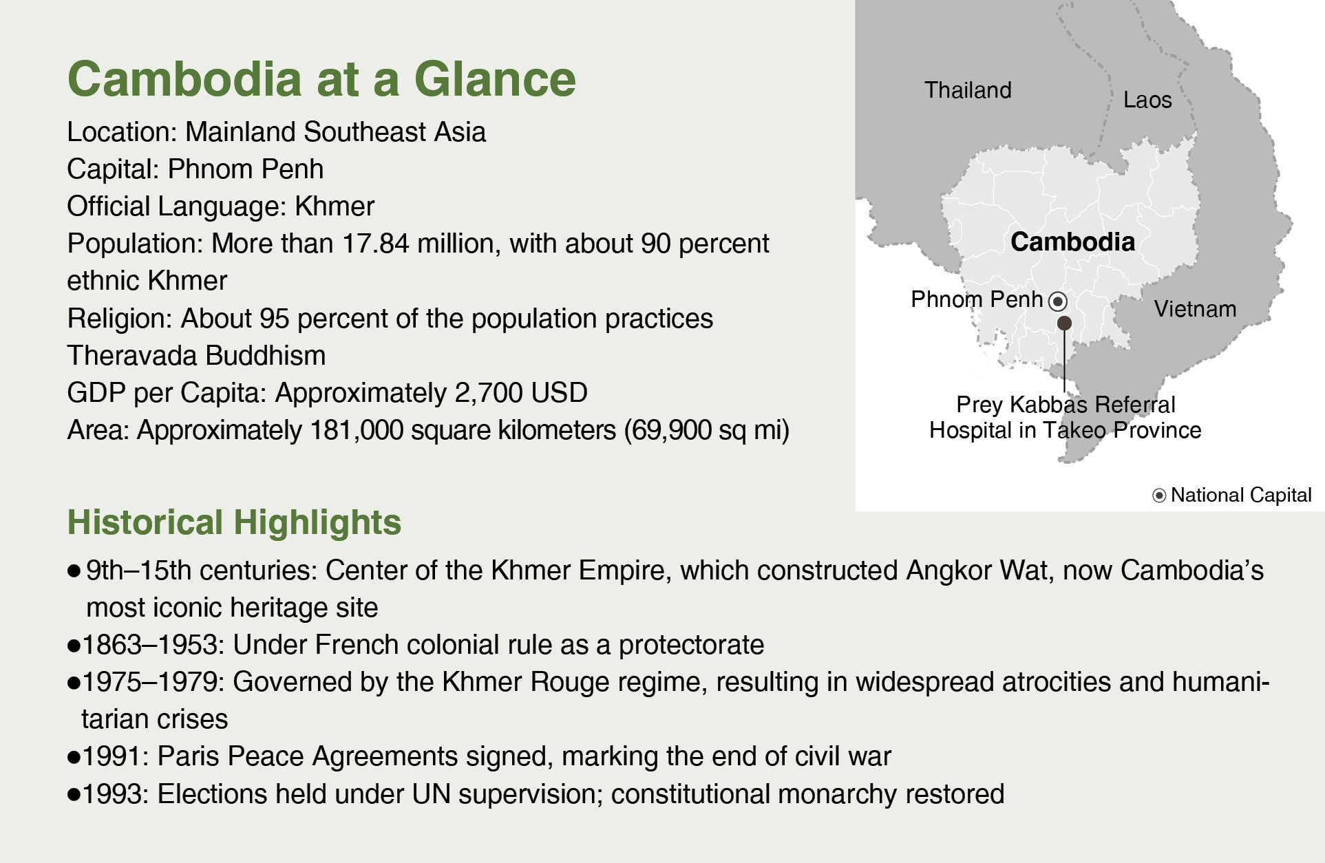 In late spring, I traveled with a Tzu Chi team from Taiwan to Cambodia to report on a free clinic for Tzu Chi Monthly. Our 90-minute drive south from Phnom Penh International Airport to Takeo Province offered a vivid glimpse of Cambodia’s blend of old and new. Tuk-tuks, motor scooters, and Japanese-imported cars shared the roads, while the route was lined with garment and shoe factories, snack stalls and carts, traditional stilt houses, and Buddhist temples. This mix of modern and traditional scenes reflected the country’s closely intertwined urban and rural life.