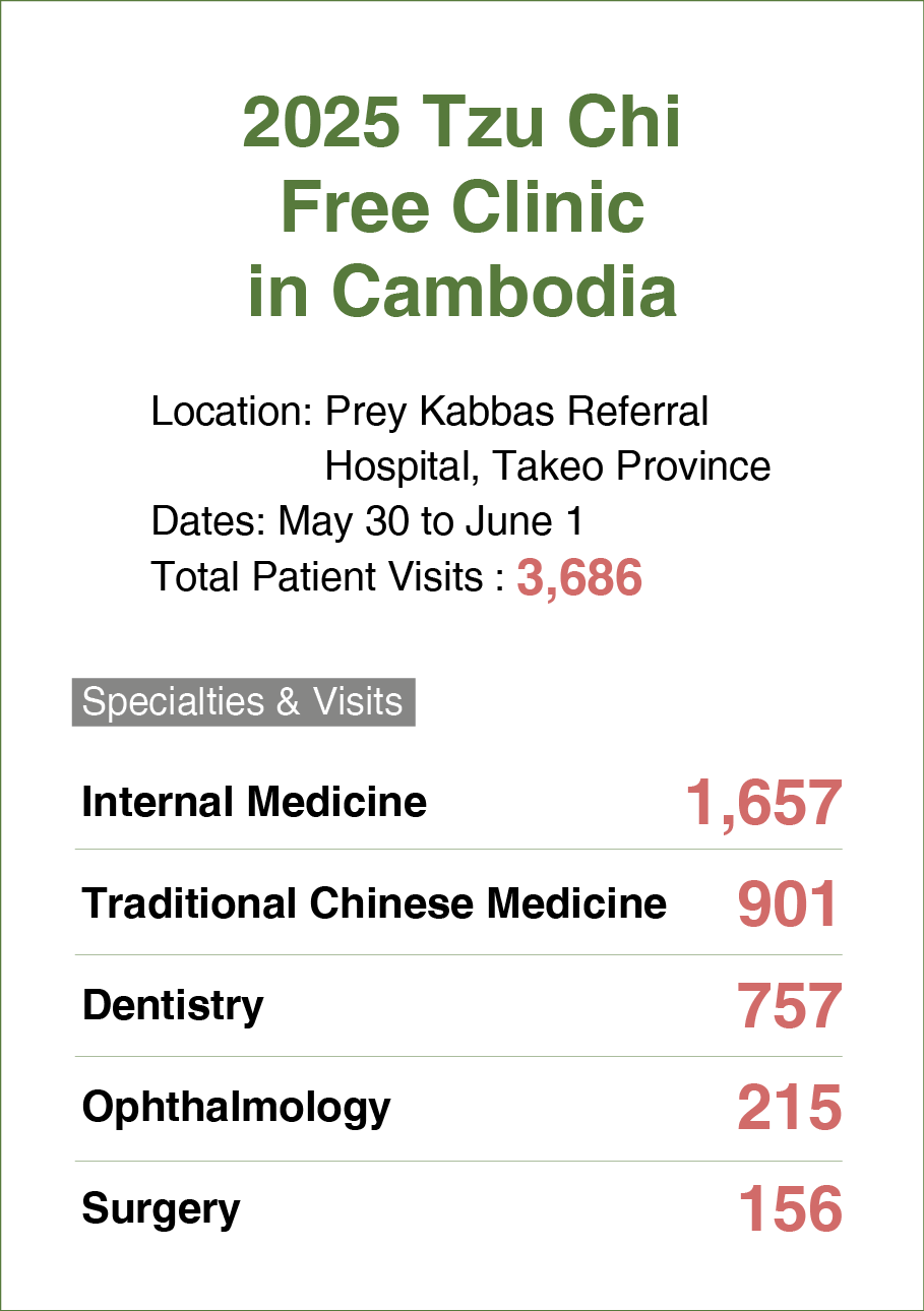 Our destination was Prey Kabbas Referral Hospital, where Tzu Chi held a large-scale free clinic in partnership with the Samdech Techo Voluntary Youth Doctor Association (TYDA). This event, one of the free clinics regularly conducted by the two organizations, offered services in five specialties: ophthalmology, dentistry, surgery, internal medicine, and traditional Chinese medicine. Over three days, from May 30 to June 1, the clinic recorded nearly 3,700 patient visits.