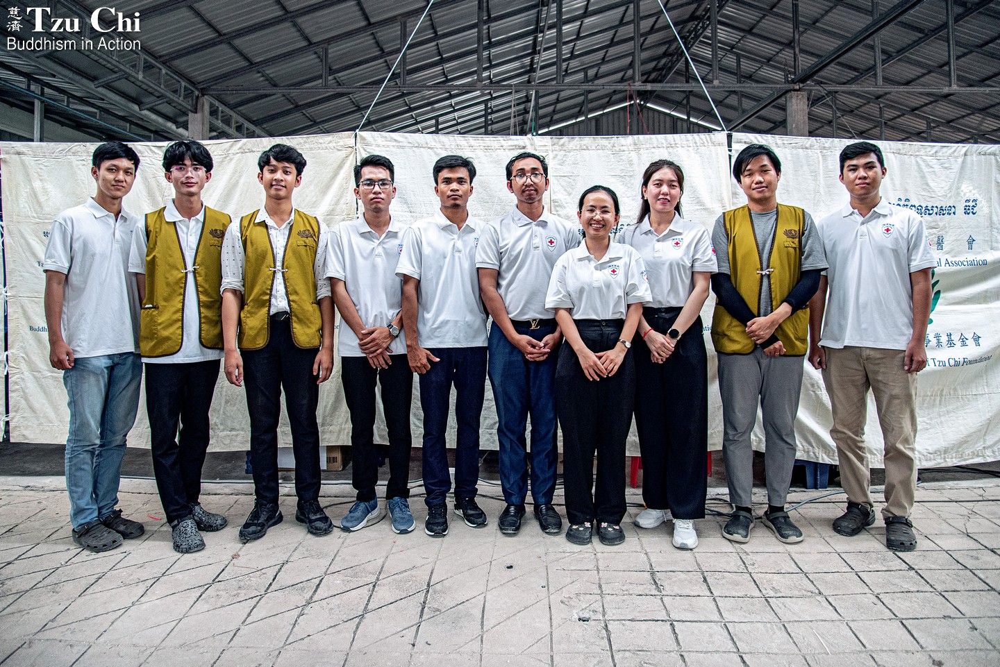 Chhay Daro (fifth from right), a young TYDA member, rushed to the free clinic to serve even though he had just finished his night shift in the emergency department. The presence of young TYDA members like him and medical students in Tzu Chi volunteer vests filled the clinic with a sense of hope. Chai Mong Ping