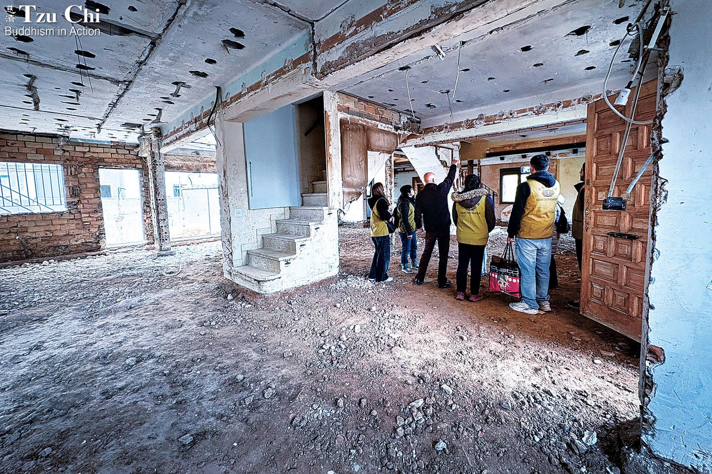 Tzu Chi volunteers visit households listed in disaster registries provided by Caritas and the Utiel municipal government. Many homes in severely flooded areas were badly damaged. Liang Xin-ling