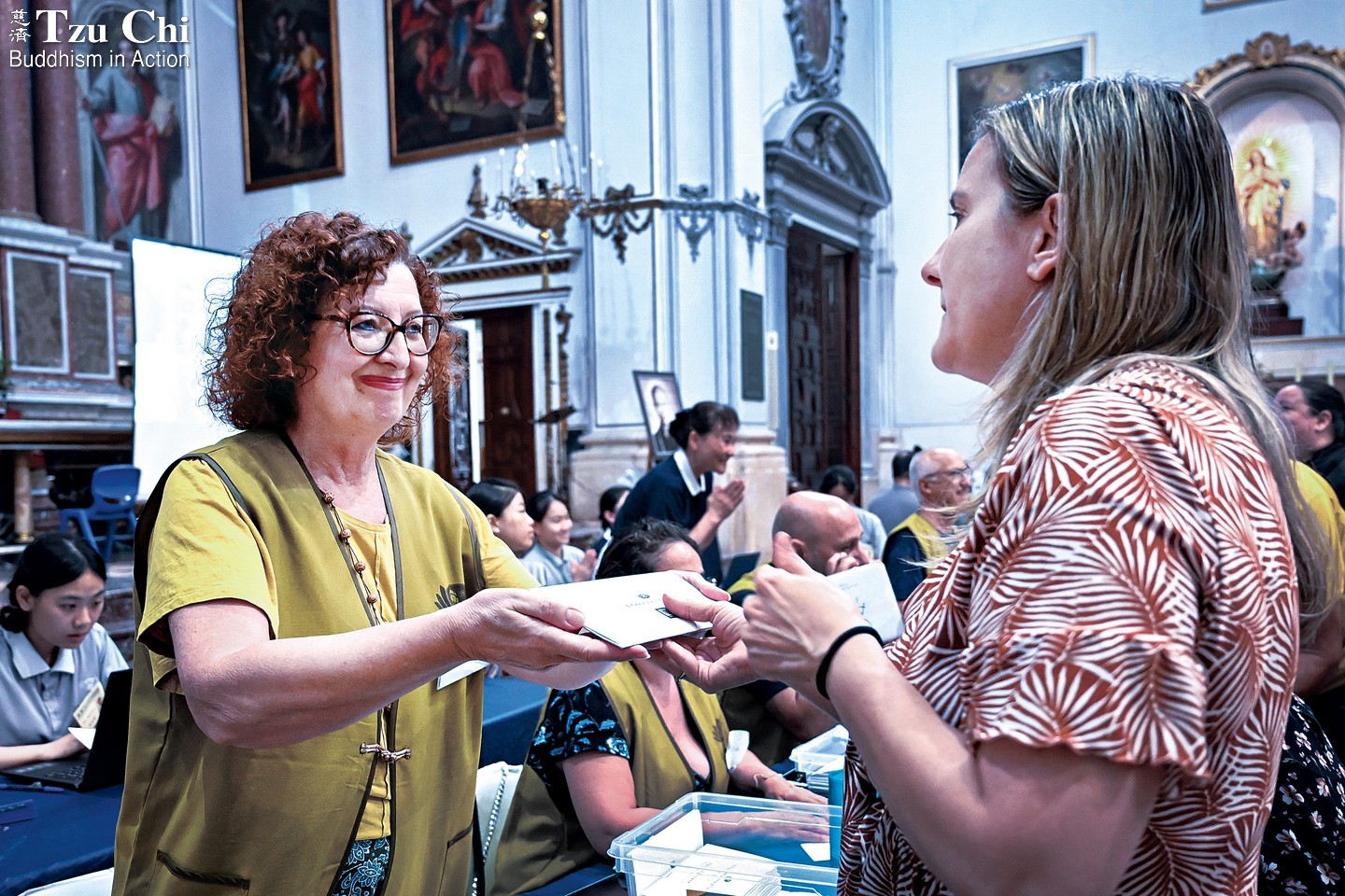 Tim Lu (呂宗翰), representing Tzu Chi’s headquarters in Taiwan, addressed those gathered. He reflected that a Buddhist organization from Taiwan distributing aid in a Catholic church in Spain was a beautiful example of interfaith harmony and a reflection of the spirit of Great Love—a selfless love that embraces all of humanity—that the world truly needed. “We’re sorry we came late,” he said, “but we’ve done our best to be here and help. What we’re most grateful for is the support of so many local Spanish volunteers. Without your help, today’s distribution wouldn’t have been possible.”