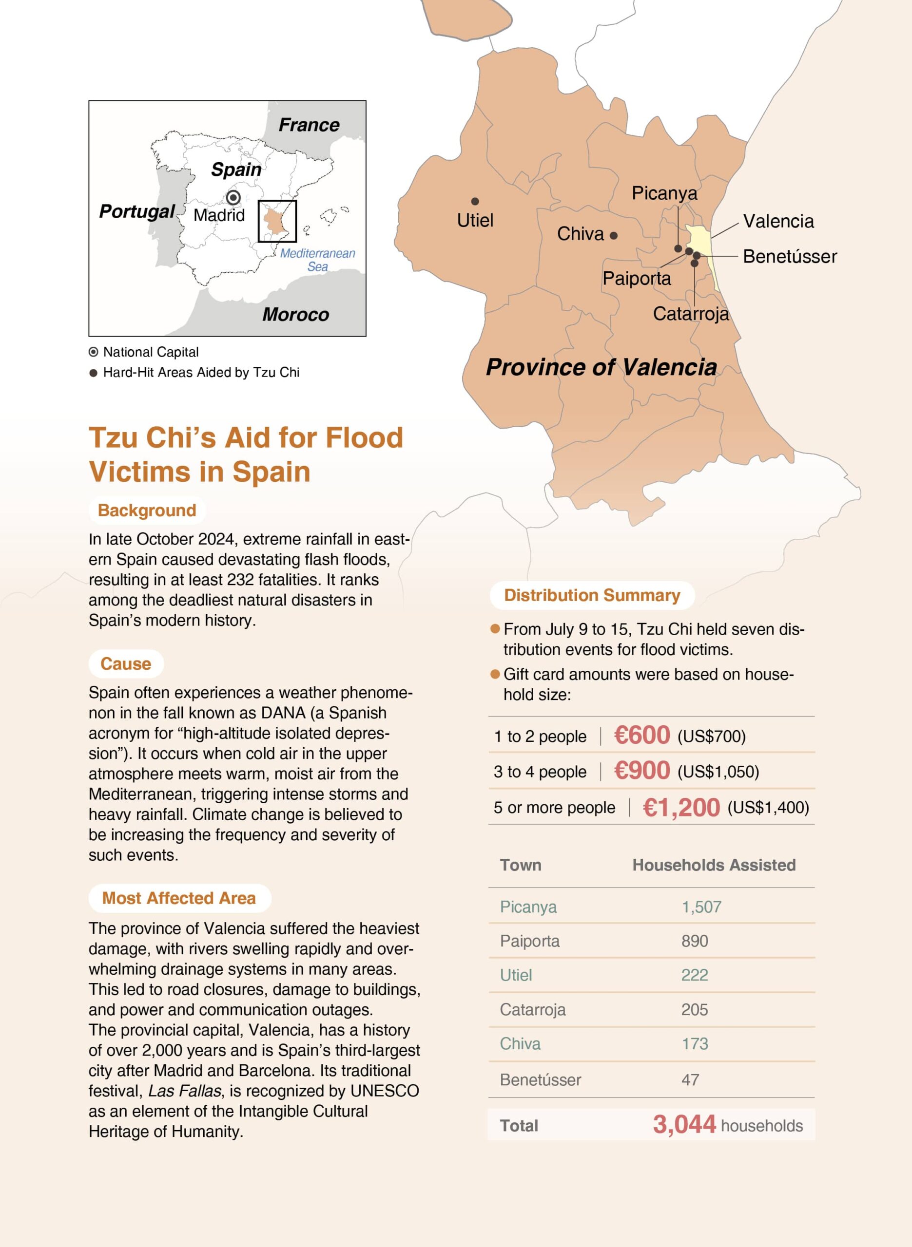 The province of Valencia was among the hardest hit. Tzu Chi volunteers in Europe conducted an initial disaster assessment, followed by six rounds of follow-up inspections. Working with local government agencies, they compiled lists of affected households and, beginning on July 9, 2025, carried out a week-long relief operation distributing supermarket gift cards to more than 3,000 families.