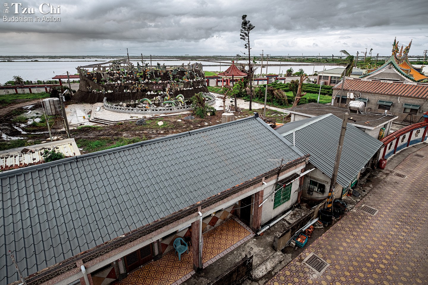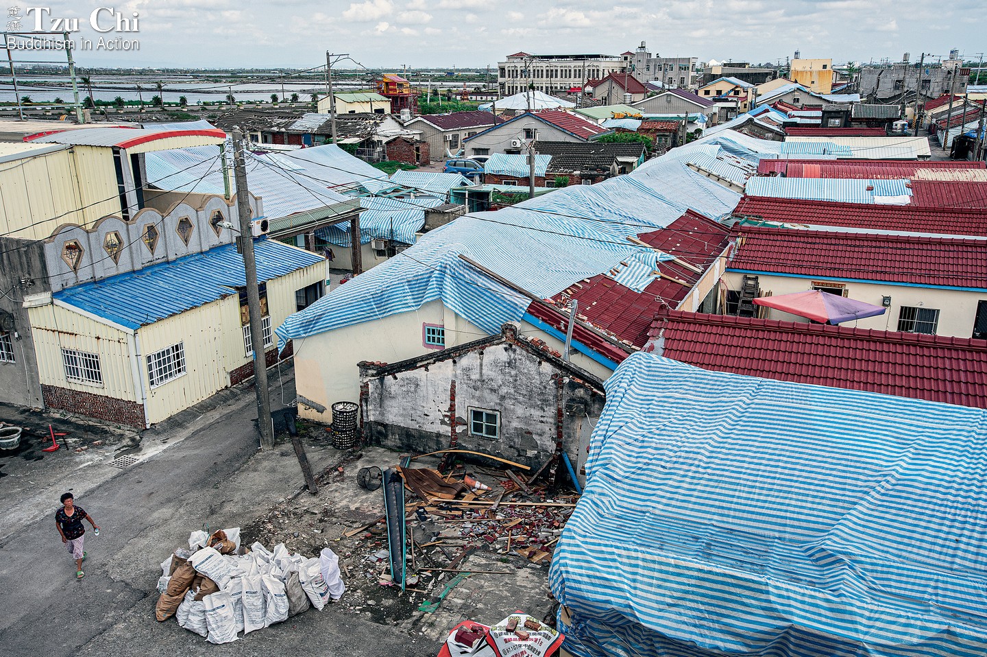 Blue-and-white striped tarps, like giant bandages, temporarily cover roofs damaged by Typhoon Danas in Xiliao, along the coast of Qigu District, Tainan. Debris from homes, collected in white nylon bags, is set aside on open ground. Tzu Chi volunteers arrived in Xiliao just two days after the typhoon to provide initial support, followed by emergency cash and tarps. After three weeks of intermittent wind and rain, the second phase of relief began, with professional contractors enlisted to repair the roofs of vulnerable households.