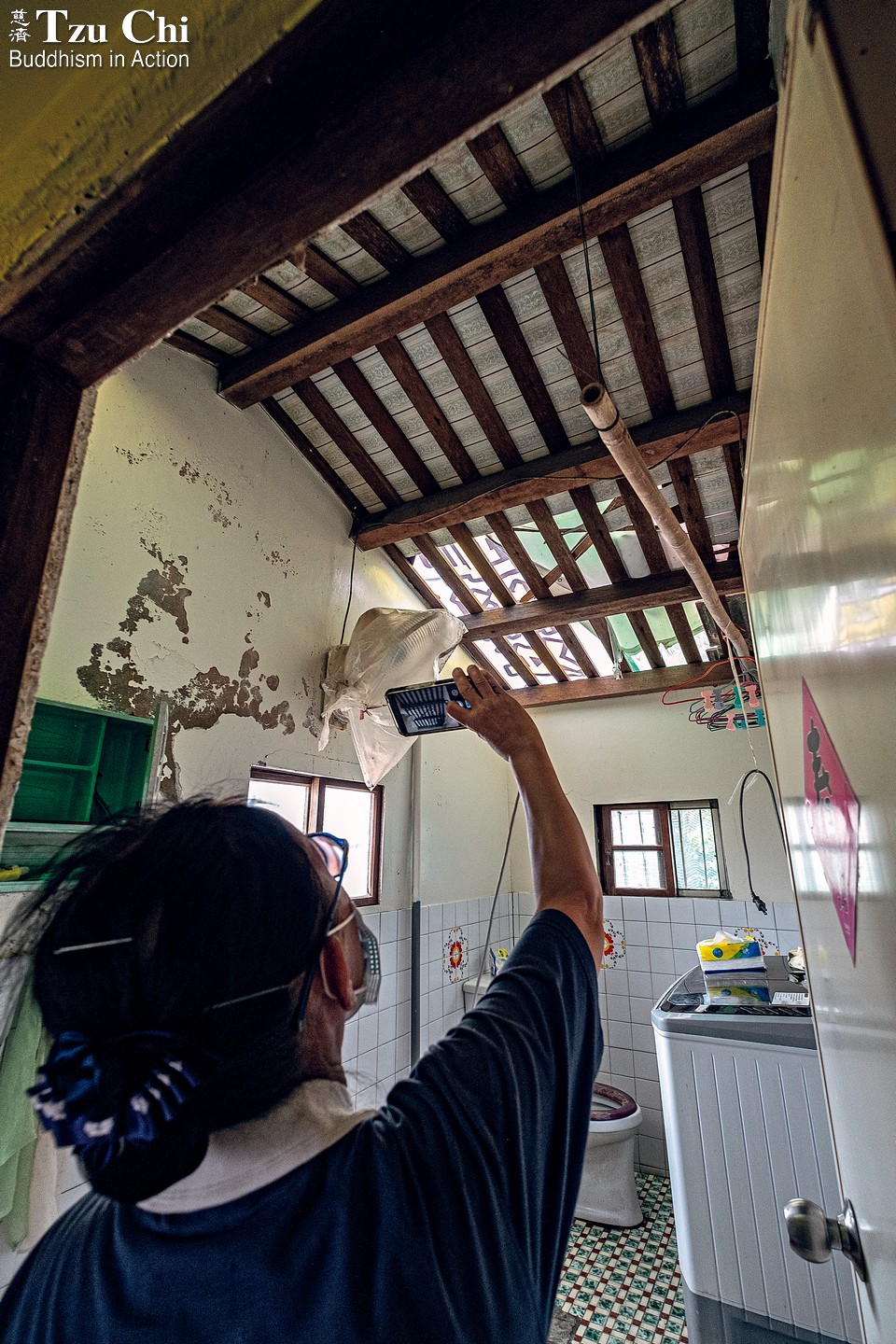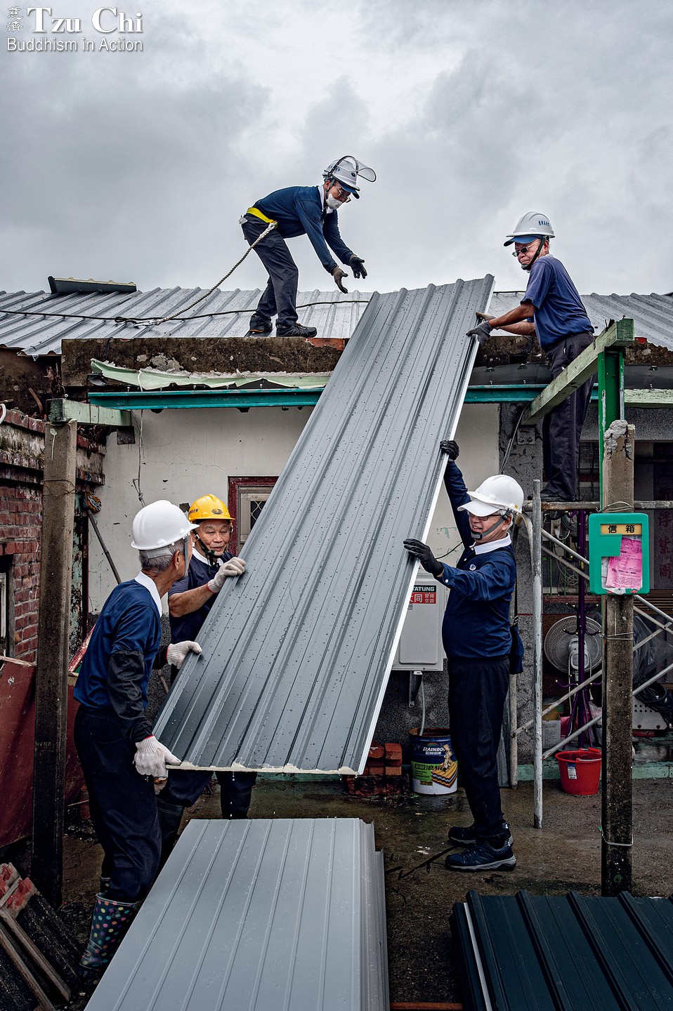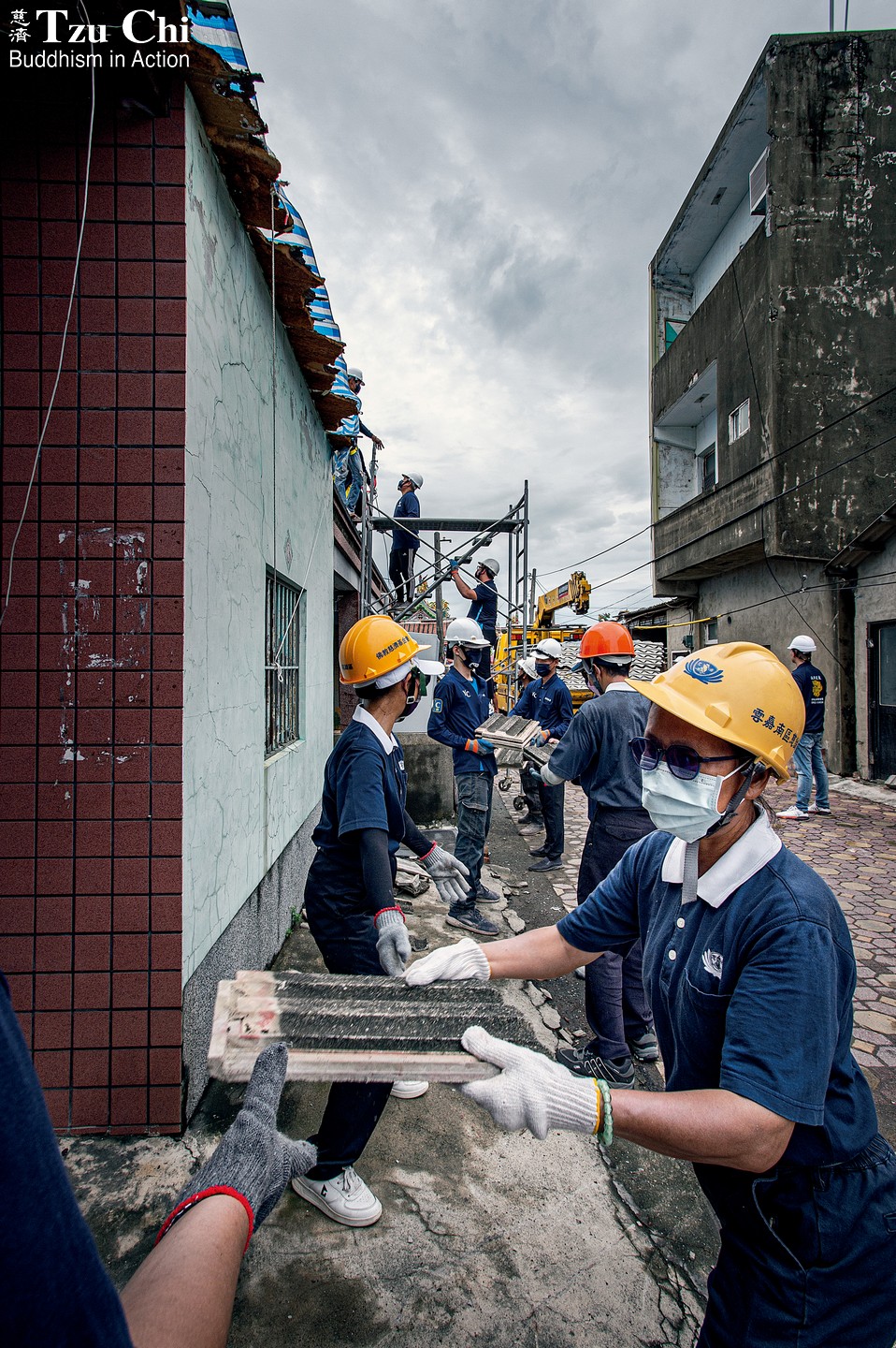 Volunteer Lin Qi-ming (林啟明) explained the strategy the teams had adopted for unpredictable weather: When conditions allowed, they would pull back tarps covering a damaged roof and remove the underlying tiles. As soon as the rain returned, the tarps were quickly repositioned and work halted. Though cumbersome, this stop-and-go method prevented water from leaking into homes and damaging furniture.