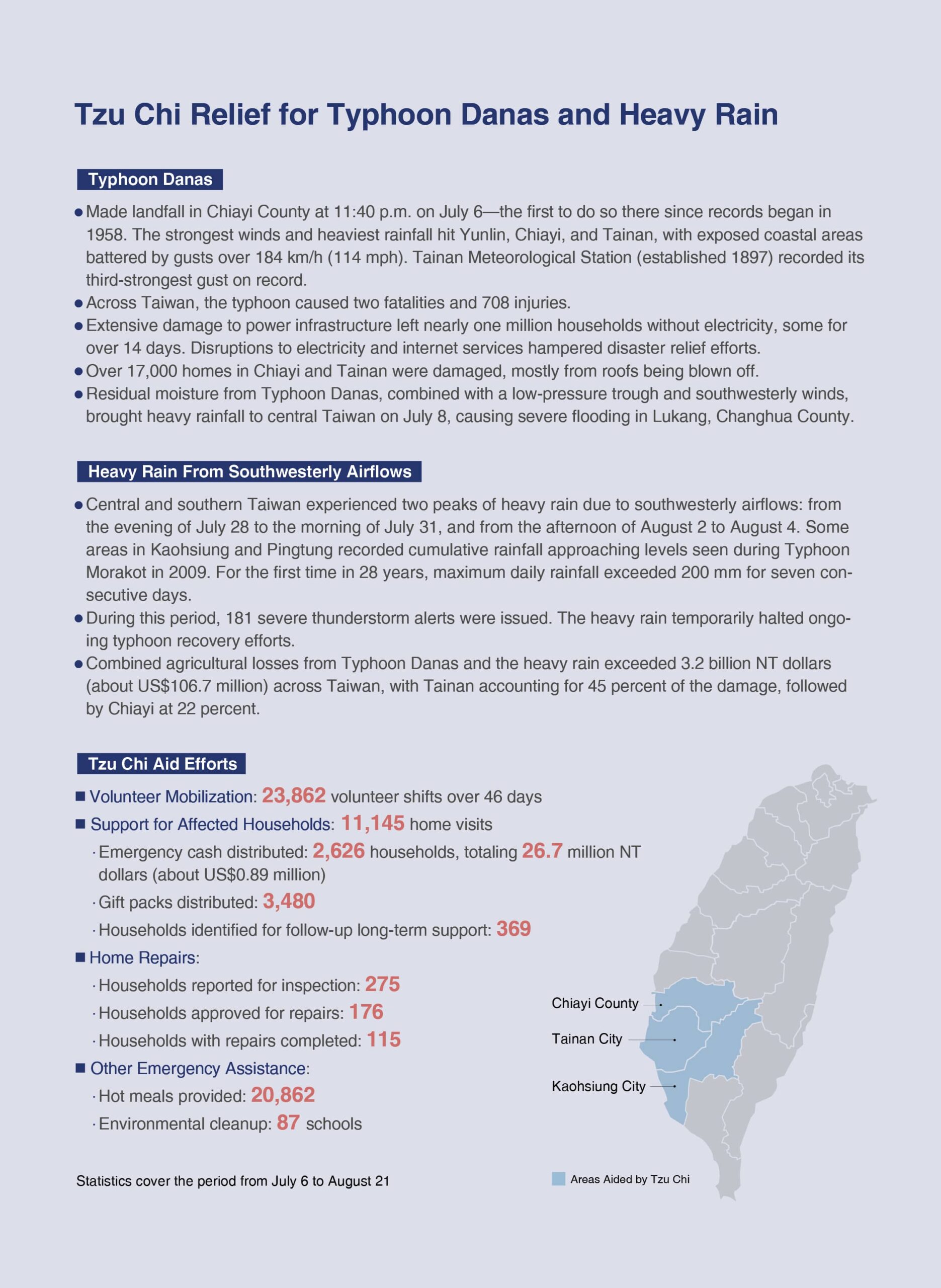 After Typhoon Danas struck Taiwan, Tzu Chi helped restore over a hundred roofs. Racing against time and making the most of every spell of good weather, repair teams brought smiles to disadvantaged residents—a reminder that after the rain, the sky always clears.