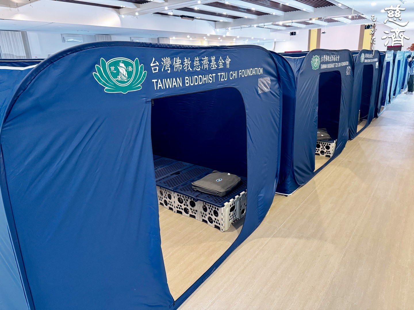 今年1月の嘉南地震の際、台南市楠西区に開設された避難所。慈済は福慧間仕切りテント、福慧ベッド、エコ毛布を提供し、安心して過ごせるスペースを設置した。(撮影・王永周)