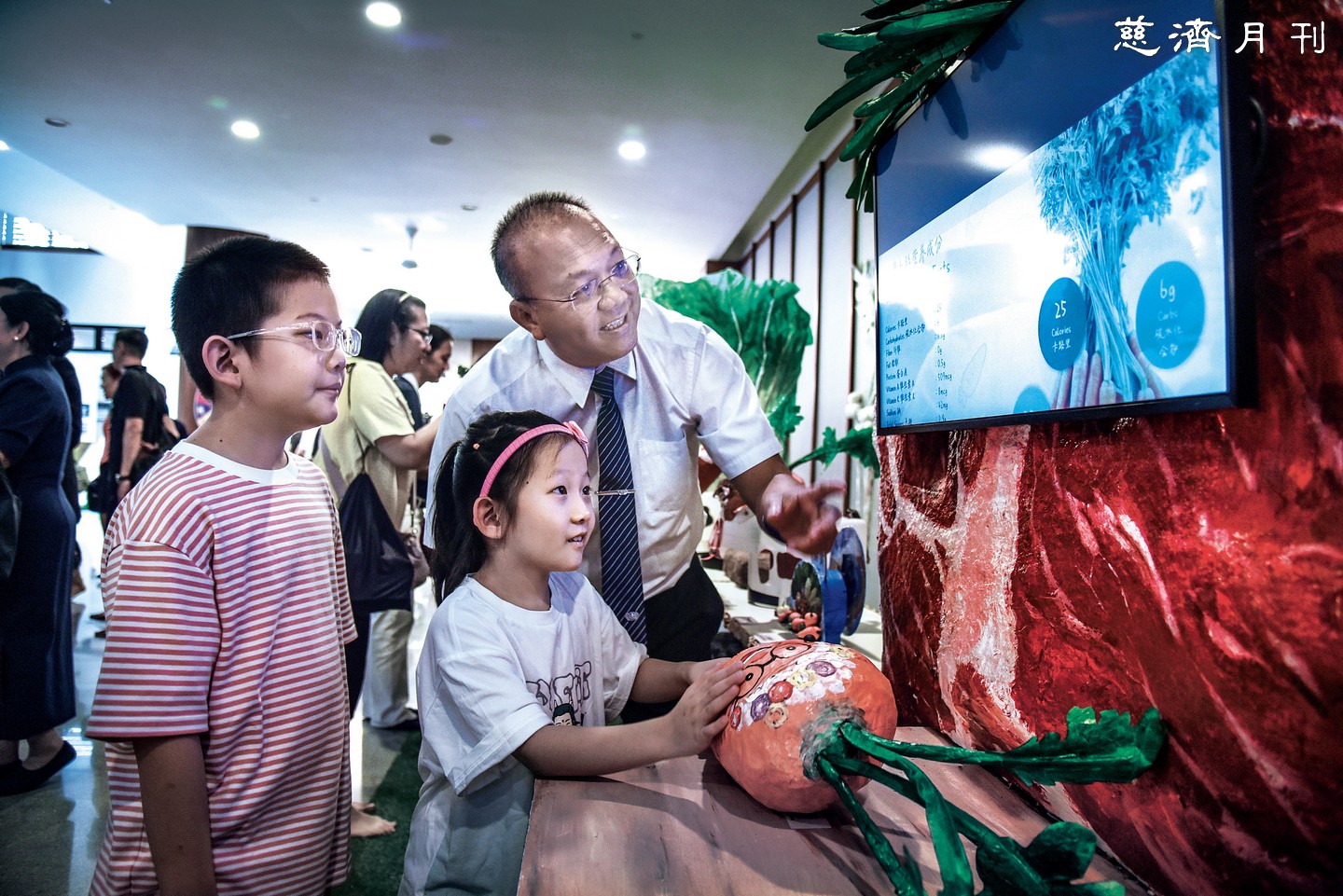 在低碳飲食展區,小朋友雙手觸碰紅蘿蔔模型,螢幕上即呈現富含的營養素及卡路里。(攝影/蔡夢萍)