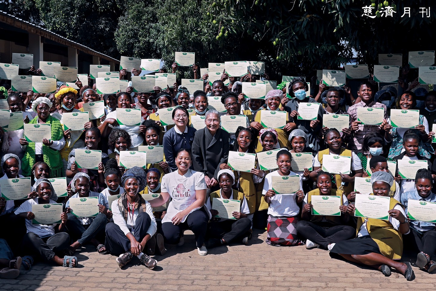 慈濟莫三比克馬普托會所二○二四年成立職訓班,包括裁縫班、針織班、烘焙坊。歷經一年學習,評量準時度、志工時數、人文學習表現、技能成績,總分超過七十五分的一百一十八位學員獲得結業證書;莫三比克志工蔡岱霖與來自臺灣的慈濟基金會林靜憪副總執行長共享這一刻的喜悅。
