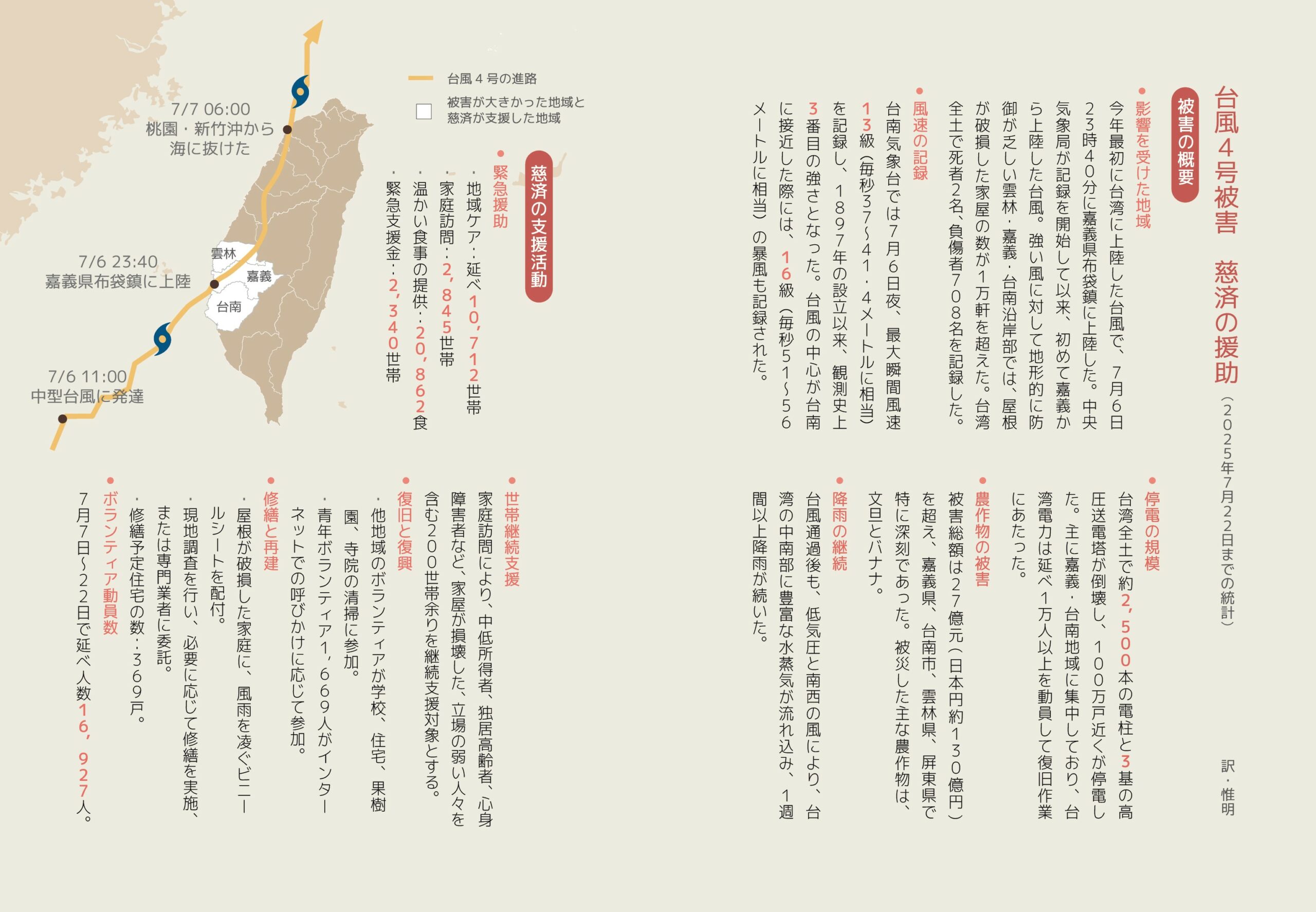 嘉義の六脚郷や布袋鎮などの地域では、点在した被害や区域的な被害の両方が見られた。停電やインターネット不通の状況下で、ソーシャルワーカーやボランティアは複数のルートに分かれて異なる町村を巡回して、家庭訪問を行った。七月九日の早朝、慈済のソーシャルワーカーである陳彦睿(チェン・イェンルイ)さんとボランティアの謝惠芬(シェ・フウェイフェン)さんは、六脚郷で九世帯の被災者を訪問し、二つの村や町を跨いだため、半日以上を費やした。訪問後、陳さんは慈済嘉義連絡所の災害対策センターに戻り、状況を報告した。会議が終わった時は、すでに夜の七時半になっていた。