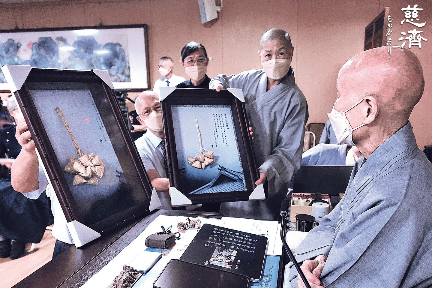 台中市清水区のイグサチームは粽をテーマにした作品を額に入れ、上人に贈呈した。(6月30日)(写真の提供・花蓮本部)