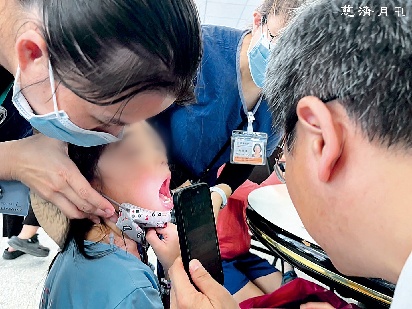 醫療站手電筒有限,張懷仁醫師臨場應變,以手機打燈檢查小朋友的喉嚨。