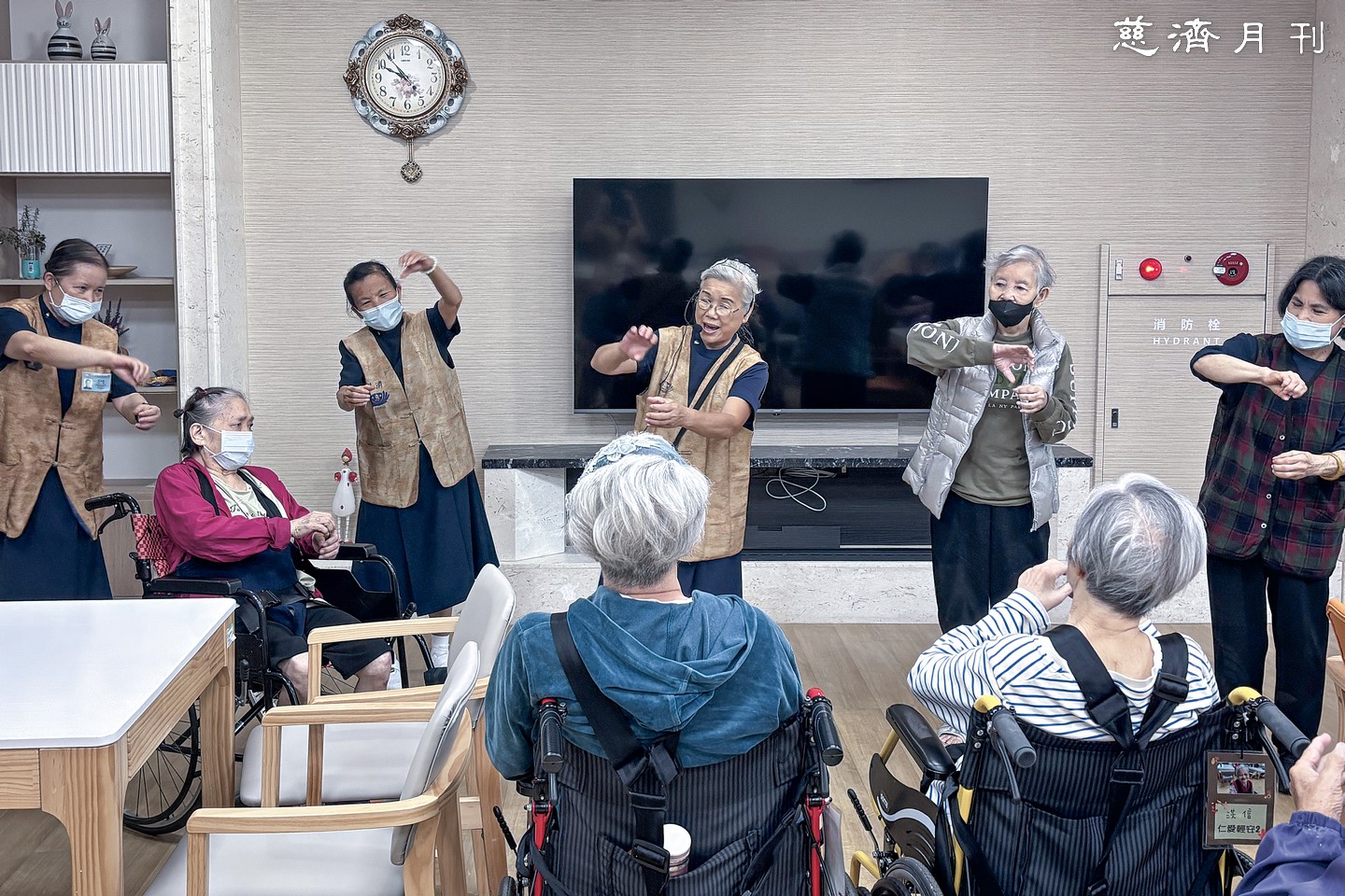 哇哈哈!我們來喝水!」每週五早上,慈濟志工張甜來到臺中市立仁愛綜合長照機構,帶動住民歌唱、律動手腳,歡笑聲、歌聲傳遍上下樓層。