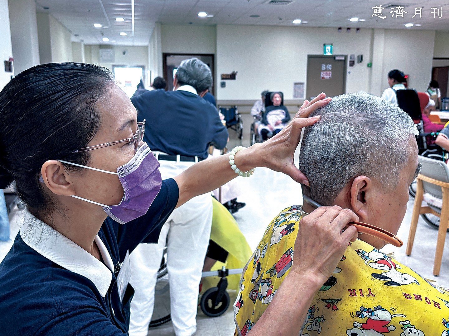 每月一次,有五、六位義剪志工在二、三樓幫長者理容。「在輕安居,義剪是必備的,第一讓志工發心、第二幫阿公阿嬤的門面打理清爽。」郭翠花說,義剪志工有兩位已超過八十歲。