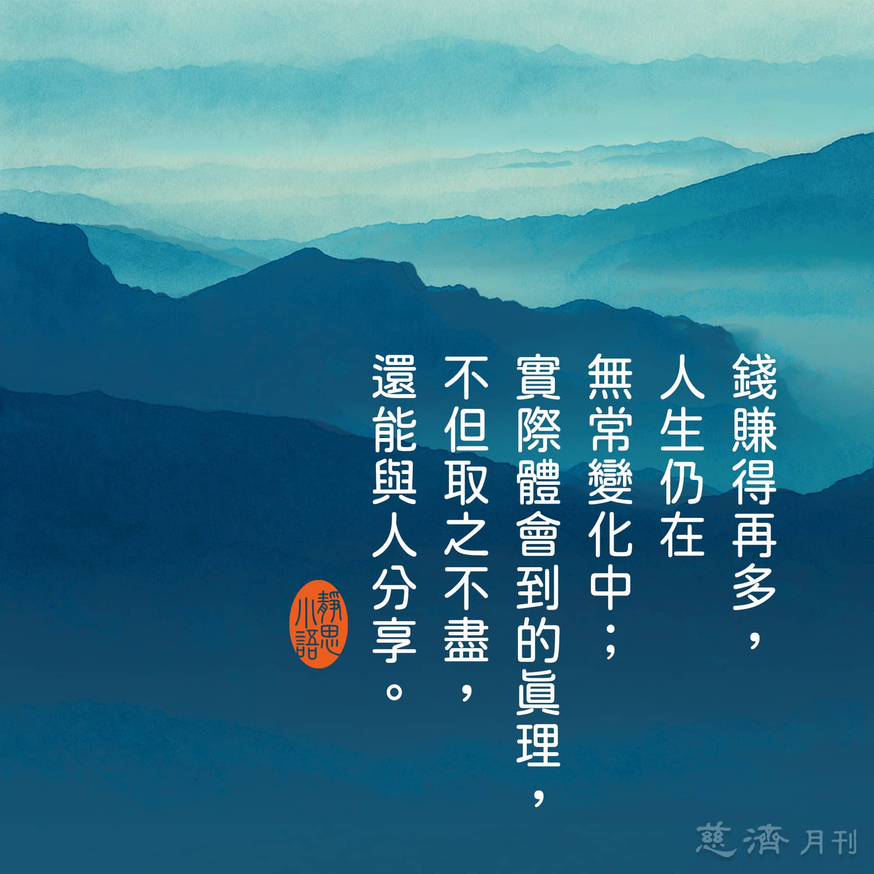 【靜思小語】錢賺得再多,人生仍在無常變化中;實際體會到的真理,不但取之不盡,還能與人分享。