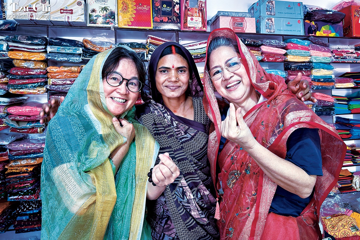 Volunteers Lim Geok Kim (right) and Ling Cui-lian (凌翠蓮, left) pose with Saraswati Devi at her store. Saraswati graduated from Tzu Chi Bodh Gaya’s first sewing class. Li Mei-hui