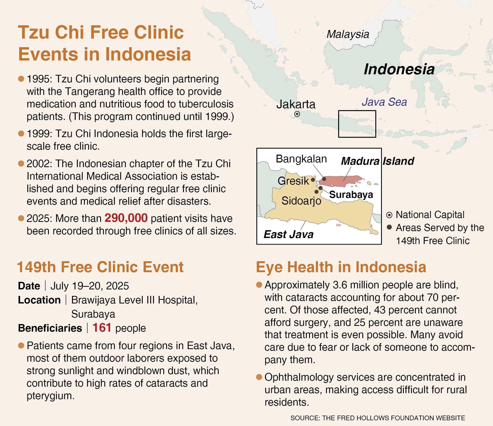 From July 19 to 20, Tzu Chi collaborated with the 5th Military Regional Command/Brawijaya to hold a free ophthalmology clinic at Brawijaya Level III Hospital in Surabaya, East Java, Indonesia. Patients came from Surabaya, Sidoarjo, Gresik, and Bangkalan. This marked Tzu Chi Indonesia’s 149th large-scale free clinic event, providing surgery for 142 cataract patients and 19 pterygium patients.
