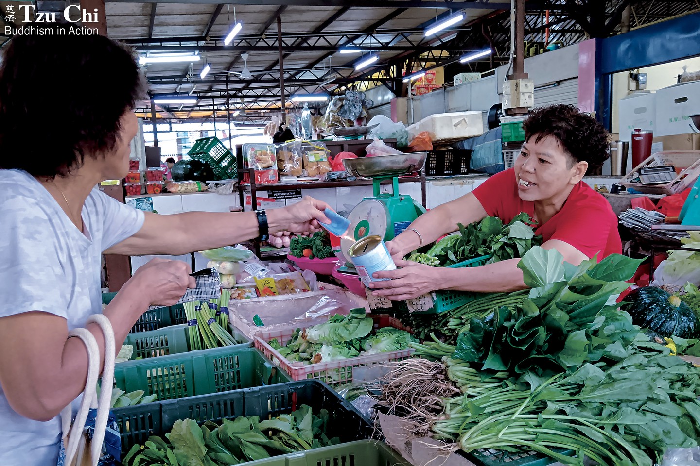 Vegetable vendor Lin Li Hui (林麗慧) was busy weighing produce and giving change to a steady stream of customers when a group of volunteers stopped by. She greeted them with a bright smile and, when invited to join the Loving Store campaign, didn’t hesitate to take a coin bank, make her donation, and invite the first customer to contribute as well. “We need to lead by example,” she said. “When others see us give, they will follow.” Affixing the “Love” sticker to her stall, she added, “It’s like placing a little kindness in your heart. Helping others truly brings happiness!” Though she usually speaks little amid the market bustle, her actions leave footprints of goodwill.