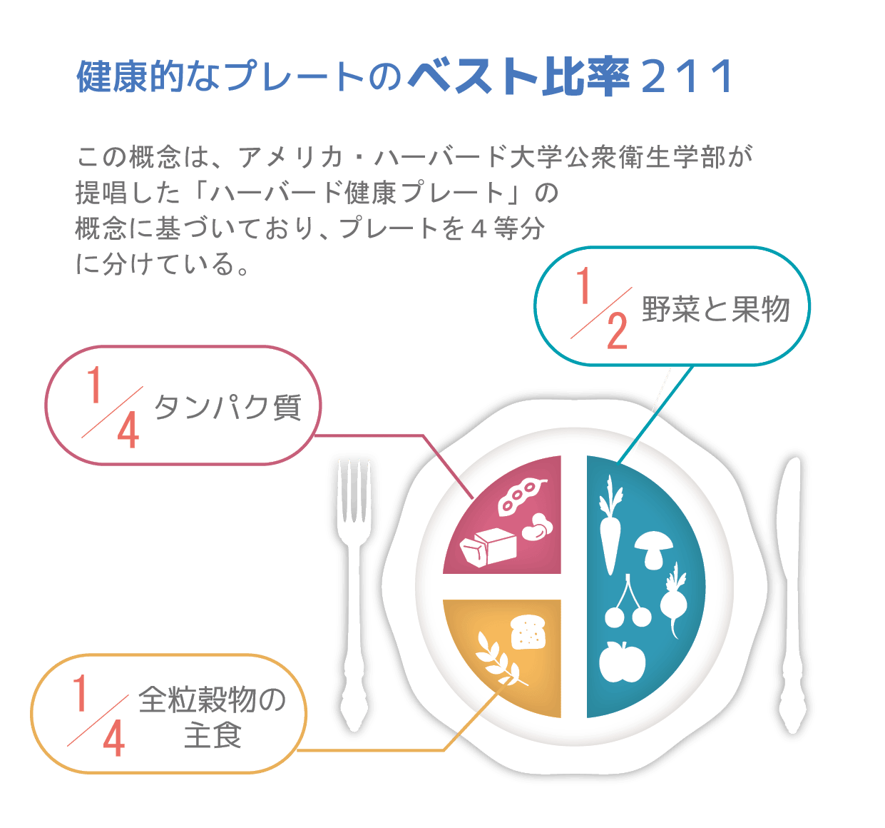- 211プレートは覚えやすい。半分が野菜と果物、後の半分がタンパク質とデンプン。