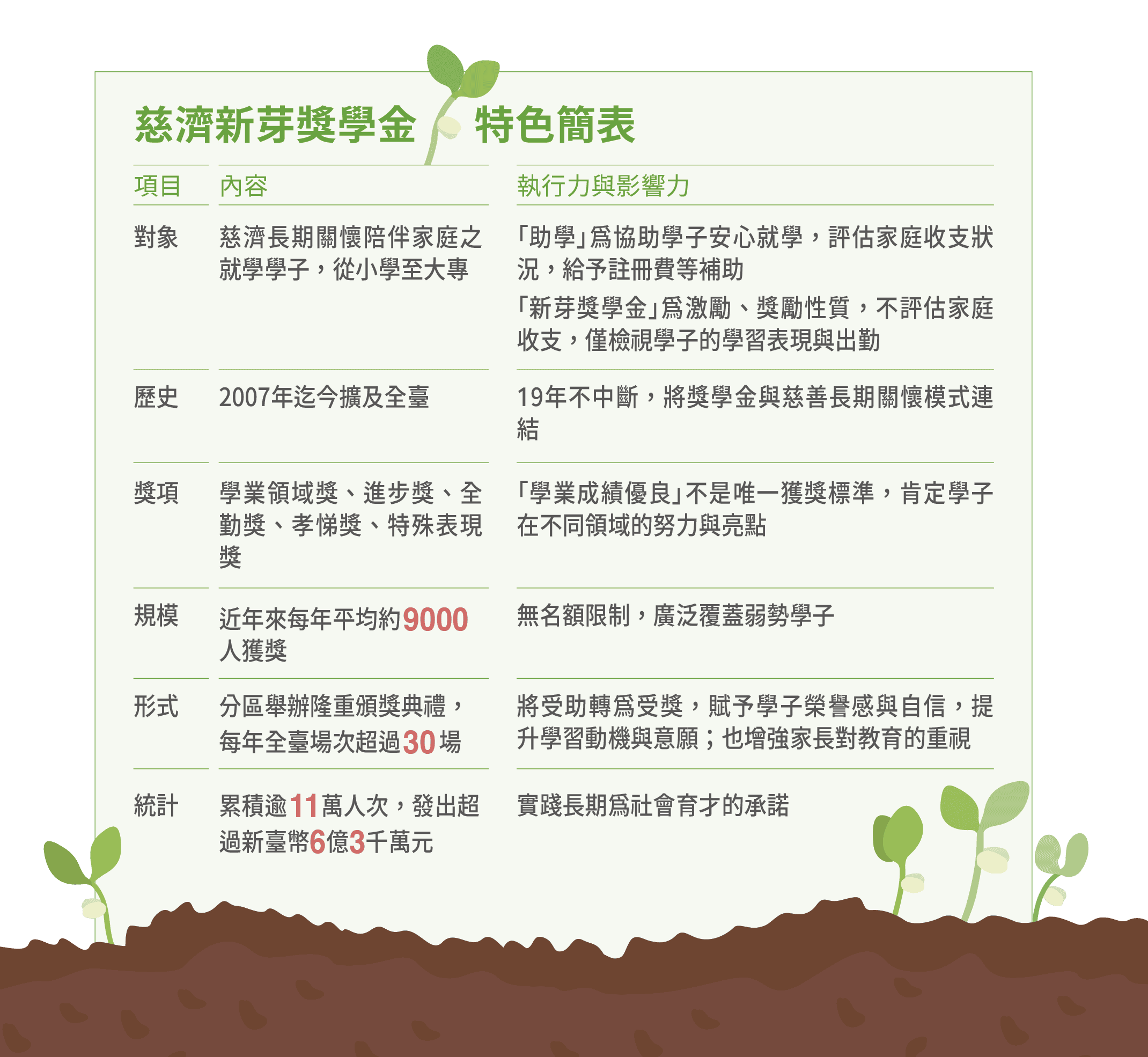 今年全臺三十三場「新芽獎學金」頒獎典禮,表揚九千四百名學子,他們自律向學,證明了逆境不是人生的限制,受助也不是終點,而是傳遞愛的起點。