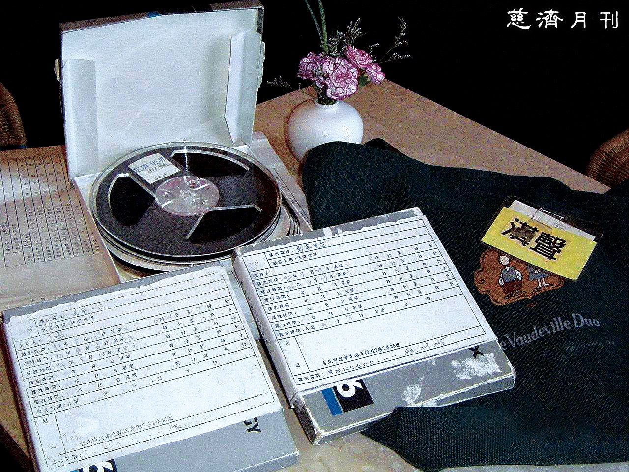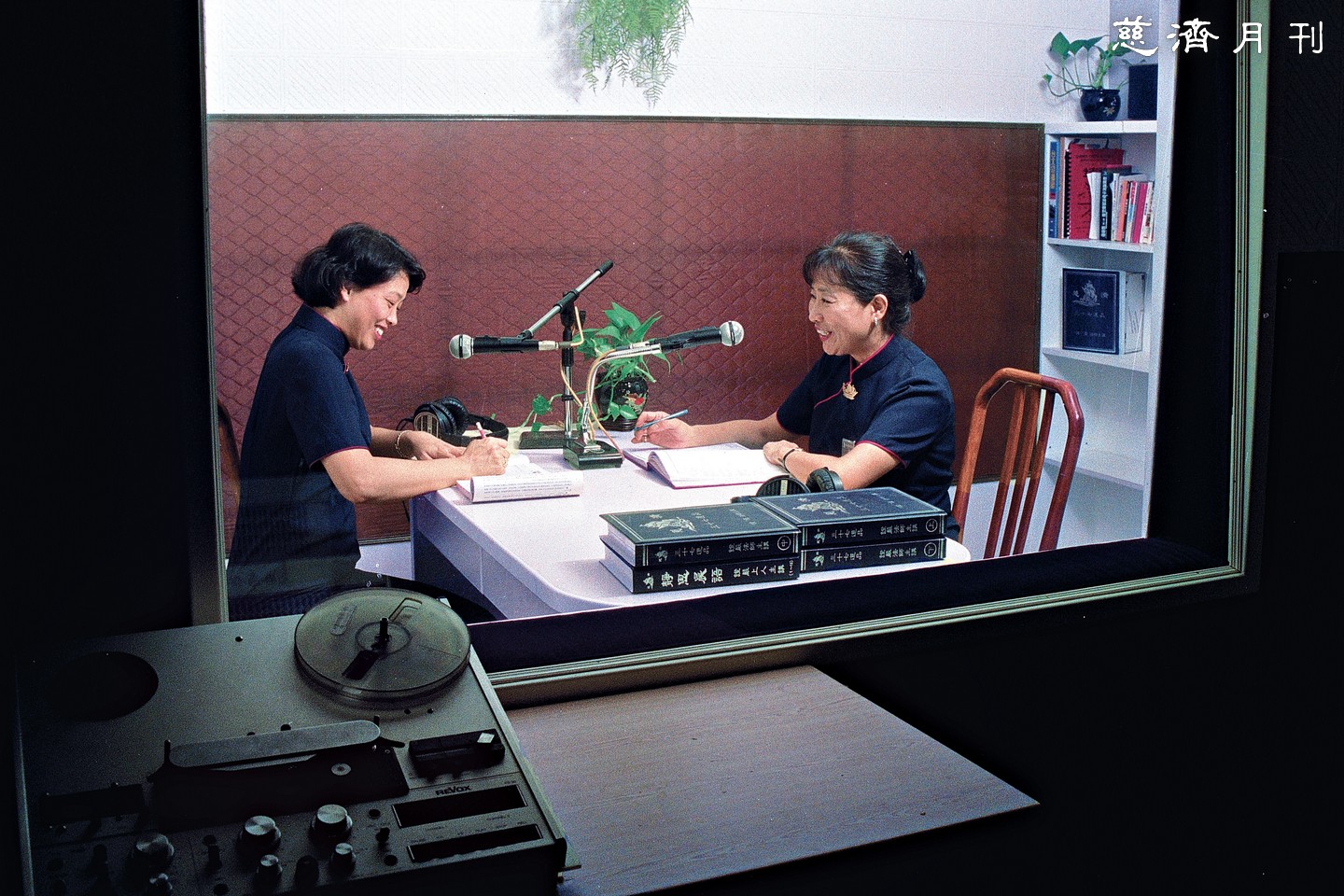 一九八五年《慈濟世界》開播,早期主持人身兼送帶者,節目錄製完畢即揹著重達十多公斤內含盤帶、錄音帶及參考資料的提袋,坐公車送往臺北市各個託播電臺(圖1)。《慈濟世界》早年由志工輪流主持,一九八九年,第一代主持人紀陳月雲(圖2右)、文素珍(圖2左)錄製節目。(圖1/翁雪慧攝影 圖2/黃錦益攝影)