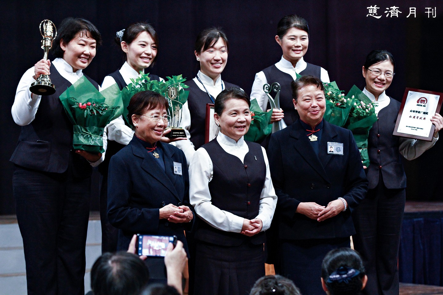 二○一三年慈濟廣播榮獲廣播金鐘獎等多個獎項,第一位廣播專職同仁慈韻(前排中)與同仁及資深志工紀陳月雲(前排左)、文素珍(前排右),於秋季聽友會上拿著獎盃、獎牌合影。(攝影/林群傑)